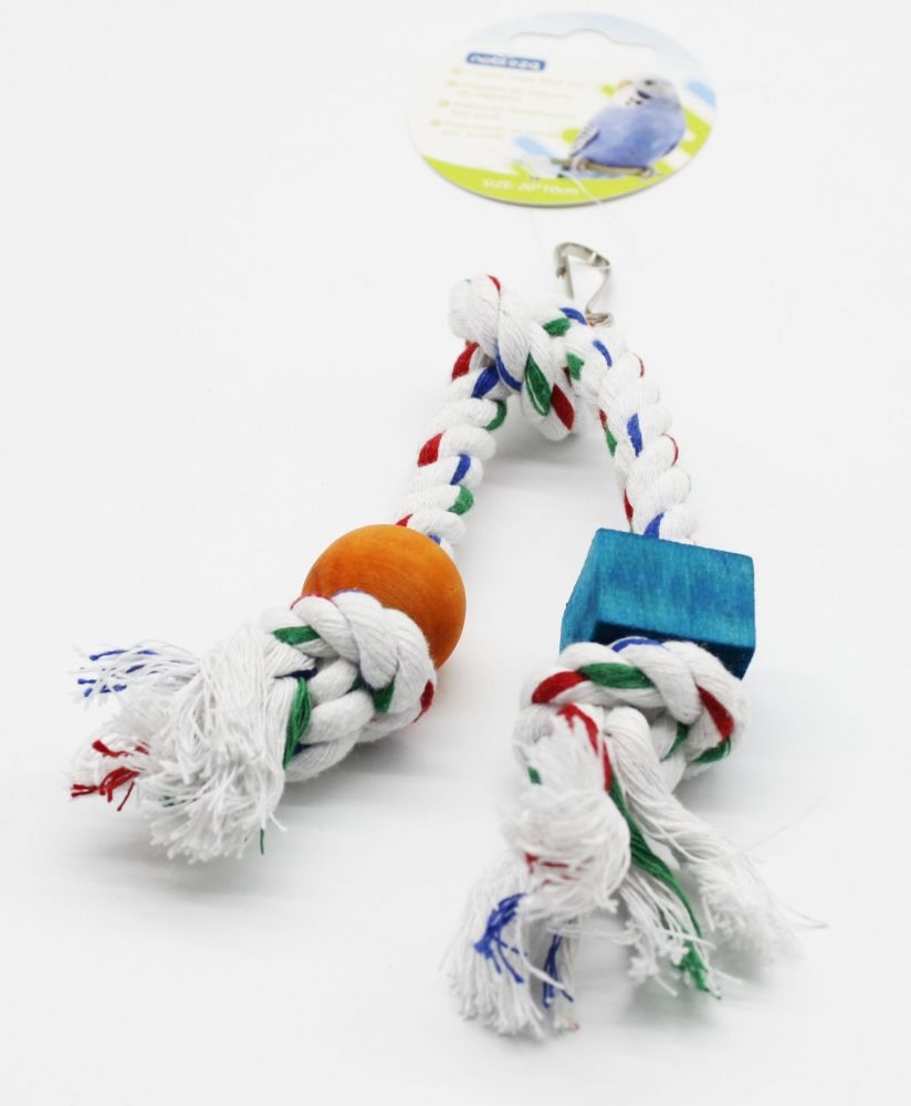 Натуральна іграшка для папуг, виготовлена з дерева та мотузки. Підходить для всіх видів папуг, допомагає сточувати дзьоб і розвивати активність. Легко кріпиться в клітці за допомогою карабіна. Рекомендується регулярно перевіряти стан мотузки та дерева, замінюючи іграшку при зносі для безпеки вихованця.