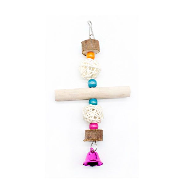 Підвісна іграшка в клітку для малих і середніх папуг. Виготовлена з натуральних матеріалів.Оснащена надійним карабіном. Для розваги папужки в комплекті металевий дзвіночок.Оригінальна конструкція іграшки дуже зручна для лазіння і послужить відмінним тренажером для Вашого вихованця.
