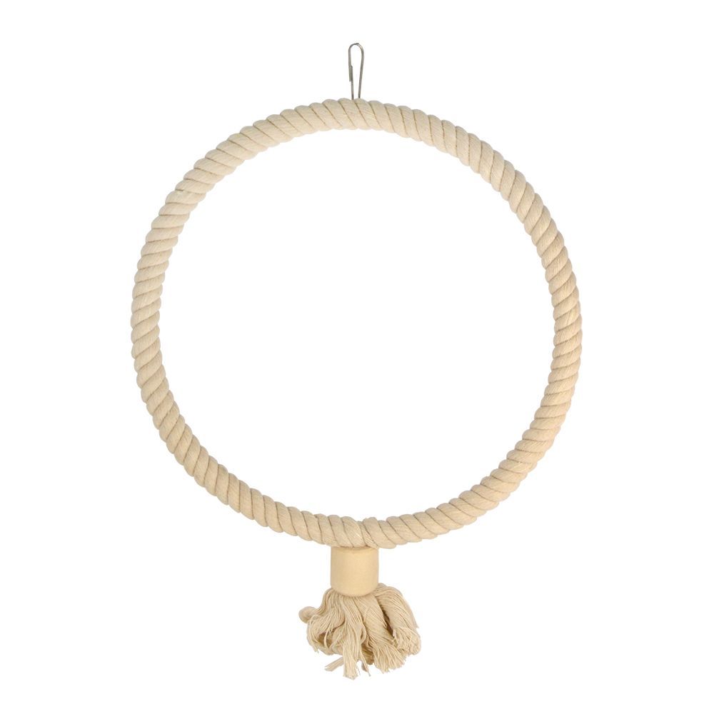 Кільце з мотузки оптимального діаметру для ігор і відпочинку середніх птахів.Може бути розміщено всередині клітини і за її межами.Підвішується за допомогою металевого гачка, який надійно і рухливо фіксує конструкцію.