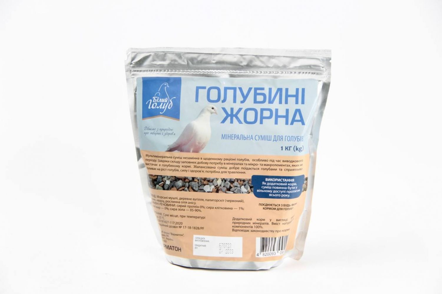Гранули різної форми від рожевого до коричневого кольору.Склад:Подрібнений ракушняк, пісок, крейда, трикальційфосфат, мінеральна крихта.Вміст мікро- та макро- елементів зумовлений їх наявністю в компонентах природного походження:кальцій6,70фосфор0,18 натрій1,6магній0,04цинк110 мгкгмідь40 мгкгзалізо2,5 мгкгмарганець90 мгкгкобальт3 мгкгсірка20 мгкгВластивостi:Голубині жорна містять мінеральні речовини природного походження, які необхідні для нормального природного перебігу фізіологічних процесів в організмі птахів: сприяють формуванню кістяка, покращують якість піря, частково забезпечують потребу в мінеральних речовинах. Гранули необхідні для роботи мязистого шлунку птахів, де беруть участь у механічному перетиранні часточок корму.Застосування:Рекомендовано застосовувати для поштово-спортивних, статних, ігрових, короткодзьобих, високольотних та інших порід голубів.Дозування:Забезпечити голубам вільний доступ до гранул протягом року, поповнюючи його запас у годівниці.Протипоказання:Не має.Зберiгання:В сухому місці при температурі від -20С до 30С.Форма випуску:Пакети з фольги по 1000 г.Термін придатності:12 місяців з дня виготовлення.Для застосування у ветеринарній медицині