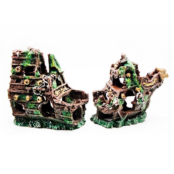 Декорація для акваріума у вигляді затонулого корабля.Складається з двох частин, які можна розмістити у різних кутах акваріуму.поліефірна смоламатеріал стійкий до дії морської водине впливає на якість води