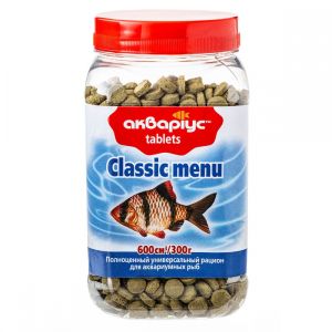 Корм CLASSIC MENU, Tablets (Класичне меню, таблетки) -універсальний раціон призначений для щоденного годування акваріумних риб будь-якого віку чи розміру. Завдяки здатності таблетки приклеюватися до скла, служить чудовим засобом для спостереження за рибами. За допомогою корму-таблетки, ви можете перетворити годування рибок на справжній атракціон. Для цього поверхню таблетки слід змочити водою і через півхвилини приклеїти її на внутрішню поверхню скла акваріума нижче за рівень води. Спостереження за рибами, які жадібно відривають шматочки корму прямо у вас перед очима принесе величезне задоволення. Ретельно збалансований за вмістом поживних речовин, вітамінів та мінералів, корм забезпечує повноцінне годування риб протягом усього життя і не вимагає доповнення раціону іншими видами кормів. Корм має чудові смакові якості, чудово поїдається рибами.Спеціальні методи переробки сировини забезпечують повне знешкодження бактерій, вірусів та паразитів, що спричиняють небезпечні захворювання акваріумних риб. Якість та безпека корму перевіряються державною лабораторією та підтверджені сертифікатом.Зміст:білка не менше 21,жиру 5,клітковини не більше 10.Застосування:годувати рибок слід 1-2 рази на добу (норма для дорослої риби 2-5 від маси тіла). Якщо риба не зїла весь запропонований корм протягом 5-10 хвилин, наступного разу необхідно зменшити його кількість.Примітка:Чи не перегодовувати Будь-який корм, який залишається тривалий час не зїденим, створює умови для зростання шкідливих бактерій в акваріумному середовищі. При правильному застосуванні CLASSIC MENU не забруднює воду.Фасування: корм продається розфасованим в полімерні пакети по 40 і 10 г, і банки обємом 600 см і вагою 300 г.ТУ У 15.7-2284014277-001-2005 сухому прохолодному місці при температурі від 0С до +30С та відносній вологості не вище 75