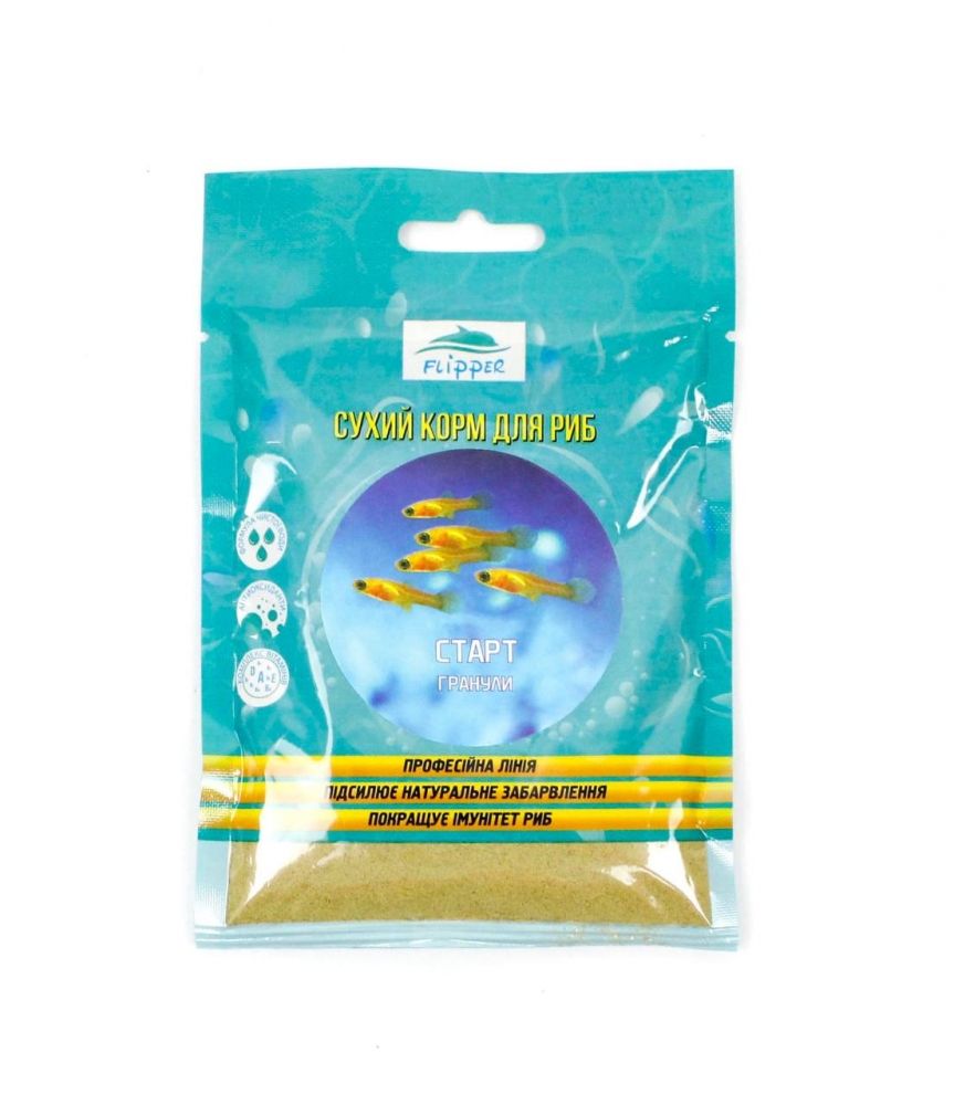 СТАРТ Flipper - гранули для мальківУніверсальний корм для мальків Старт. Спеціальний стартовий корм для мальків ікромечущих рибок (лабіринтові, барбуси, даніо, сомики) з перших днів життя. Добре узгоджується з іншими видами кормів. як штучних, і живих. Баланс компонентів сприяє зростанню та зміцненню імунітету рибок. Повністю відсутні патогенні організми. Чи не погіршує якість води, не каламутить воду.Чому варто купити універсальний корм для мальків Золота рибка Старт- сприяє швидкому зростанню- якісний склад- високоефективний стартовий корм- підходить для щоденного вживанняСклад:білків 47, жирів 6,5, клітковини 3,0, а також необхідний комплекс вітамінів та мінералів у фізіологічно оптимальних для малька концентраціях.Застосування:для малька віком до 1 місяця - до 8 разів на добу в кількості до 100 маси корму ваги рибки: від 1 до 2-х місяців - 3-5 разів на добу в кількості 30 від маси рибки після 2-х місяців - 2-3 рази на добу в кількості 15 корми від 150000000000 Якщо ні, порцію потрібно зменшити.