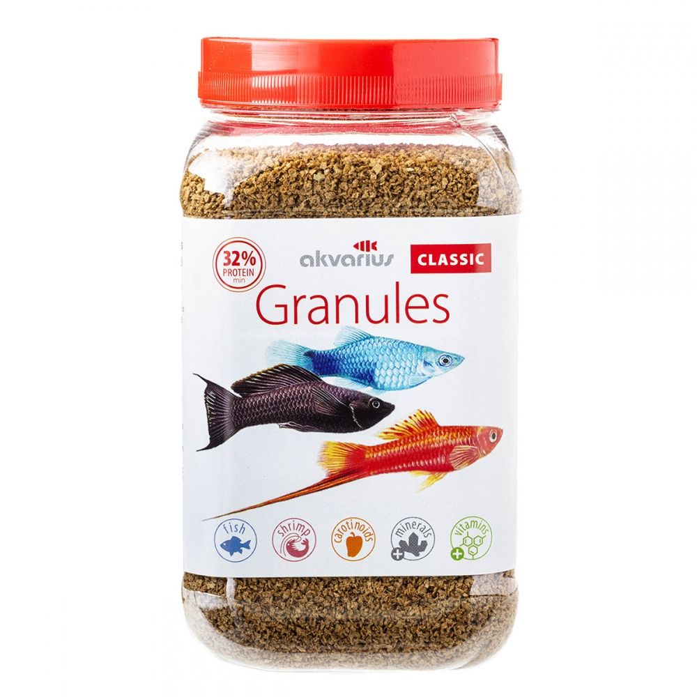 Акваріус Classic Menu Granules - базовий раціон, що підходить для молодняку та риб невеликого розміру, таких, як неони, гуппі, даніо-реріо.Виготовлений у вигляді дрібних гранул, що дозволяє малюкам харчуватися без проблем.Ретельно збалансований за вмістом поживних речовин, вітамінів і мінералів корм забезпечує повноцінне годування риб, підвищений вміст білка дає хороший поштовх для росту молодняку.Classic Menu Granulesне вимагає додавання до раціону інших видів кормів.Корм має чудові смакові якості, чудово поїдається рибами.Спеціальні методи переробки сировини забезпечують повне знешкодження бактерій, вірусів та паразитів, які спричиняють небезпечні хвороби акваріумних риб.Якість та безпека корму перевіряються державною лабораторією та підтверджені сертифікатом.Зміст:білка не менше 21, жиру 5, клітковини не більше 10.Застосування:Годувати рибок слід 1-2 рази на добу з розрахунку 0,1-0,5 г на одне годування залежно від виду та розміру риби (норма для дорослої риби 2-5 корми від маси тіла).Молодняк потрібно годувати 2-3 рази на добу в кількості 15 від маси тіла.Якщо риба не зїла весь запропонований корм протягом 5-10 хвилин, наступного разу необхідно зменшити його кількість.Будь-який корм, який залишається тривалий час не зїденим, створює умови для зростання шкідливих бактерій в акваріумному середовищі.При правильному застосуванні Classic Menu Granules не забруднює воду.Примітка:Не перегодовуватиДеякі види акваріумних риб мають схильність до переїдання, що може призвести до хвороби і навіть загибелі риби.