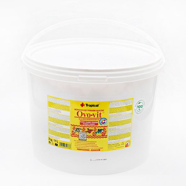 Tropical Ovo-vit це зміцнювальний корм, подібний до пластівців, з добавкою яєць.Постачає рибам цінний білок, ненасичені жирні кислоти та добре засвоюваний лецитин із яєчних жовтків.Завдяки своєму складу пластівці Ovo-vit сприяють зростанню, дозріванню і початку нересту риб, тому рекомендуються насамперед у період нересту, а також для молодих, риб, які ростуть, і потреба яких у поживних компонентах є особливо високою.Стабілізований вітамін С зміцнює імунну систему, а натуральні каротиноїди, що добуваються, зокрема, з перцю і креветок, підсилюють забарвлення риб.Добавка цеоліту сприятливо впливає на травну систему та видалення токсинів з організму риб.Годування:багаторазово упродовж дня малими порціямиСклад:риба та рибні субпродукти, зерно, яйця і яєчні субпродукти мінімум 6, екстракт рослинного білка, молюски та ракоподібні (зокрема борошно з цільних креветок мінімум 0.5), мясо та субпродукти тваринного походження, дріжджі, субпродукти рослинного походження (зокрема екстракт із червоного перцю 5 000 мгкг), водорості, олії та жири, мінерали (зокрема, цеоліт 1)