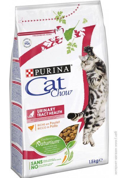 Сбалансированний состав минеральних веществ и низкое содержание магния для снижения риска образования мочевих камнейКорм CAT CHOW Urinary Tract Health подходит для питания кошек, предрасположенних к развитию мочекаменной болезни. Корм сбалансирован по составу минеральних веществ, содержит низкий уровень магния для поддержания оптимальних значений рН и снижения риска образования мочевих камней.У кошек наиболее распространенним видом мочевих камней являются отложения струвитов.Дослідження показують, що підвищення кислотності сечі може бути використано в якості профілактики струвитной сечокамяної хвороби.Склад інгредієнтів і збалансований мінеральний склад корму CAT CHOW Urinary Tract Health сприяє підтримці кислотності сечі в діапазоні значень рН 6,0-6,5, при яких струвитние відкладення не можуть формуватися.Відомо, що низький вміст магнію в складі кормів для кішок також сприяє підтримці здоровя сечовивідної системи.Склад: Злаки і продукти переробки злаків, продукти переробки мяса і мясних субпродуктів, тваринний жир, продукти переробки овочів та злаків (хв. 0,5 моркви), соєве борошно, корінь цикорію (хв. 0,5 цикорію), вкусоароматическая кормова добавка, мінеральні речовини, регулятор кислотності Е338, барвники, ріпакова борошно (хв. 0,05 ріпакової борошна), подрібнений шпинат (хв. 0,5 шпинату), амінокислоти, антиоксиданти (E320, E310, E321), подрібнена петрушка (хв. 0,2 петрушки), розмарин (хв. 0,006 екстракту розмарину)Вміст поживних речовин в 100 г: сирий білок 34 г, сирий жир 12 м , сира зола 7,0 г, сира клітковина 2,2 г, кальцій-1,2 г, фосфор 1,2 г, калій 0,7 м, метіонін 0,7 г, магній 0,1 г, залізо 16,0 мг, цинк 16,0 мг, марганець 2,0 мг, мідь 2,0 мг, селен 48 мкг, вітамін А 12000 МОкг, вітаміни групи В 285 мг100г, вітамін D3 1200 МОкг, вітамін Е (-токоферол) 100 мгкг, вітамін С 70 мгкг.