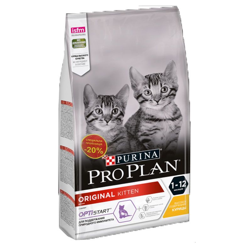 Містить OPTISTART з коровячим молозивом, яке достовірно зміцнює імунну систему кошенят на місцевому та системному рівні: посилює виробництво в кишечнику секреторного імуноглобуліну А (IgA), а також підвищує циркулюючі рівні вакцино-специфічного імуноглобуліну G (IgG) після вакцинації. Містить природний джерело ДГК (докозогексаеновой кислоти), яка відіграє найважливішу роль в оптимальному розвитку клітин сітківки і нейронів. Високий вміст білків (40) для посиленого розвитку безжирової маси тіла. Збалансований комплекс мінералів для здорового росту кісток.Годування кошеняти відрізняється від годування дорослої кішки або кота: для нього потрібно набагато більшу кількість протеїнів (білків) і кальцію. Корм PRO PLAN для кошенят забезпечує всі потреби зростаючого організму вихованця завдяки високому вмісту білка, а також поєднанню необхідних поживних речовин, зокрема вітамінів С і D, а також антитіл і омега-3 жирних кислот. Формула OPTISTART підтримує природний імунітет кошеня завдяки молозива у складі, що покращує баланс кишкової мікрофлори і стимулює місцевий кишковий імунітет.Рекомендації по годівлі: Переводите кошеня на корм Pro Plan JUNIOR у віці 3-4 тижні. Для більш легкого поїдання корм слід змішувати з водою. Поступово зменшуйте кількість додається для розмочування води до того моменту, коли кошеня зможе їсти не розмочений корм. Дотримуйтеся 2-3 разового годування або давайте корм за необхідності. Для вагітних кішок мінімальна добова норма 90 гдень, для годуючих мінімальна добова норма 180 г день або за необхідності. Для більш докладного пояснення консультуйтеся з Вашим ветеринарним лікарем. Рекомендації по годівлі, що дозволяють підтримувати ідеальну форму можуть змінюватись в залежності від віку тварини, її активності та умов навколишнього середовища. Слідкуйте за вагою Вашої кішки і коректуйте кількість дається корму. Слідкуйте, щоб у Вашої кішки завжди була чиста, свіжа питна вода. Для здоровя Вашої кішки регулярно консультуйтеся з ветеринарним лікарем.Склад: курка (20), сухий білок птиці, рис, пшеничний глютен, тваринний жир, кукурудза, кукурудзяний глютен, концентрат білка гороху, кукурудзяний крохмаль, яєчний порошок, мінеральні речовини, вкусоароматическая кормова добавка, дріжджі, рибячий жир, консерванти, вітаміни, амінокислоти, колострума (0.1).Мікроелементи: МОкг вітамін А: 36 000 вітамін Д3: 1 200 вітамін E: 670 мгкг: вітамін C: 140 залізо: 87 йод: 2.2 мідь: 13 марганець: 41 цинк: 130 селен: 0.12.Гарантовані показники: білок: 40, вміст жиру: 20, сира зола: 7.5, сира клітковина: 1.0, докозагексаєнова кислота: 0.05.Умови зберігання: У сухому прохолодному місці