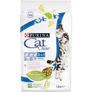 Формула потрійної дії допомагає захистити зуби від утворення нальоту і зубного каменю, містить мінерали для здоровя сечовивідної системи та доповнено джерелами клітковини для контролю утворення грудок шерсті в шлунково-кишковому тракті.Повнораціонний і збалансований корм на основі мяса індички, трав і овочів вищої якості, що задовольняє всі потреби дорослої кішки від 1 року.Корм 3 in 1 - це унікальний рецепт, який міститься в кожній гранулі та надає оптимальний раціон для Вашої кішки, але найважливішим є те, що воно може використовуватися для профілактики відразу трьох найбільш поширених котячих патологій.Переваги корми:Високий вміст мяса - джерело високоякісного білка в кожній порції для підтримання оптимальної маси тіла.Високий вміст вітаміну Е для підтримки природного захисту організму кішки.Поєднанню натуральних інгредієнтів: трав і овочів (петрушка, шпинат, морква, горох).Містить мякоть буряків та цикорію, підтримують здорове травлення та зменшують запах від туалетного лотка.Добірні інгредієнти надають особливий аромат, який кішки воліють інстинктивноСклад:злаки (натуральні інгредієнти), мясо та субпродукти тваринного походження (індичка - 4, мяса та субпродуктів - 14), екстракт рослинного протеїну, олії і жири, буряковий жом сушений (2,7), овочі (корінь цикорію сушений - 2, моркву - 1,3, шпинат - 1,3, горошок - 1,3), мінеральні речовини, дріжджі, петрушка - 0,4, антиоксиданти, регулятори кислотності.Гарантований аналіз:Протеїни - 34,0 Жири - 11,0 Зола - 7,0 Волога - 7,5 Клітковина - 4,5