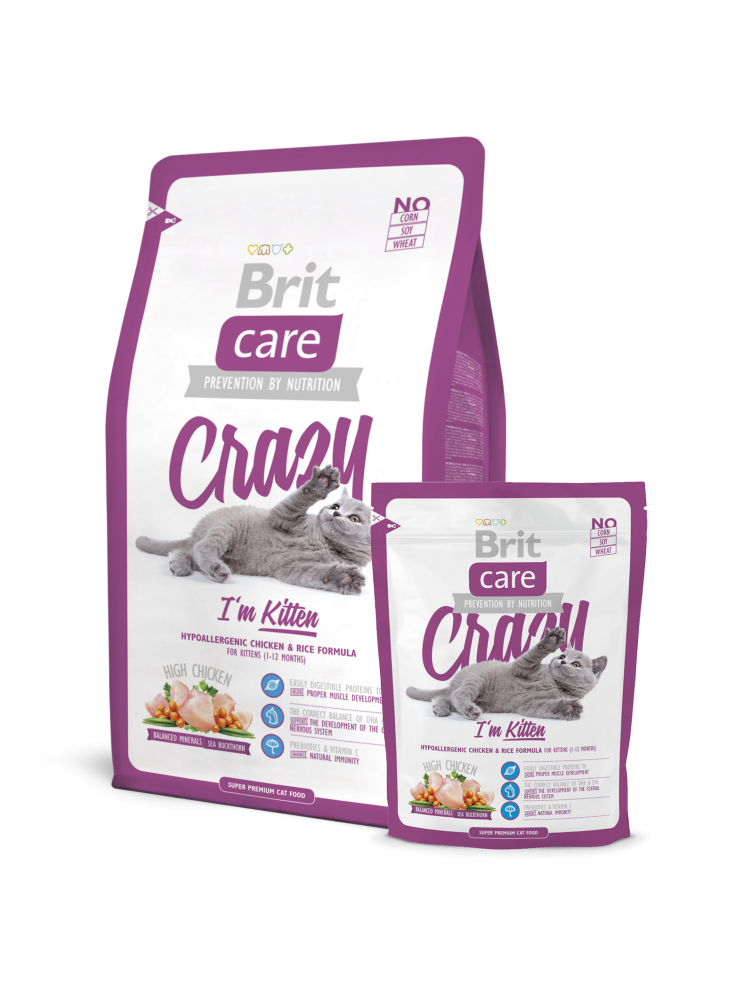 Вдосконалена серія кормів супер-преміум класу Brit Care Cat відрізняється новим підходом до розробки і створення особливо смачних і корисних раціонів для кішок.Всі інгредієнти ретельно підібрані і виготовлені особливим чином, що дозволяє зберегти їх корисні властивості.Кожна формула унікальна і відповідає індивідуальним котячим потребам, адже кожна кішка - це індивідуальність, зі своїм особливим способом життя і перевагою в їжі.Особливості нових раціонів Brit Care Cat:Використання гіпоалергенних, швидко і легко засвоюваних інгредієнти: курка, індичка, лосось, олень і рис.Всі компоненти ретельно підібрані і додані в правильній пропорції, за рахунок чого ймовірність появи алергії або харчової непереносимості - мінімальна.Всі раціони мають особливо привабливим ароматом, адже кішки в першу чергу реагують на запах їжі, а не на смак.Кожна формула Brit Care піклується про здоровя травної системи кішок і сприяє зміцненню імунітету за рахунок вмісту MOS і FOS. MOS (манан-олігосахариди) необхідні для підтримки оптимального балансу мікрофлори та уповільнення розвитку патогенних бактерій в кишечнику. FOS (фрукто-олігосахариди) створюють особливий захисний шар на стінках товстого кишечника і дають живильне середовище для розмноження корисної мікрофлори, що є запорукою відмінного імунітету у кішок.В состав Brit Care Cat включили сбалансированний комплекс из жирних кислот Омега-3 и-6, цинr и медь в хелатной форме, что обеспечивает здоровье кожи и красоту шерсти.Специальний комплекс антиоксидантов (витамин Е, С, органический селен) активно связивает продукти окисления в организме, обеспечивает отличное здоровье взрослих кошек, а также замедляет процесси старения.Brit Care Cat Crazy Kitten- висококачественний гипоаллергенний корм с курицей и рисом для котят.Преимущества:Полноценное питание для котят, восполняет потребности в питательних веществах, витаминах и микроелементах.Містить гіпоалергенні легкоперетравлювані інгредієнти, піклується про здоровя травної системи і зміцнює імунітет.Багатий рідкими речовинами, які важко відтворити в природному годуванні.Забезпечує здоровий ріст і розвиток кошеня, покращує здатність навчатися.Містить екстракт Юки Шідігера для підтримки роботи травлення.Склад корму:Дегидрированная курка (25), філе курки (22), рис, курячий жир (консервирован токоферолами), рисовиеотруби, сушені яблука, лососеве масло (3), куряча печінка (2), пивні дріжджі, мананоолигосахариди (165 мгкг), фруктоолігосахариди (135 мгкг), екстракт юки Шідігера (Yucca Schidigera) (90 мгкг), обліпиха крушиновидна (50 мгкг).