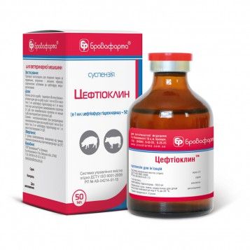 Состав1 мл препарата содержит:цефтиофура гидрохлорид 50 мгОписаниеЖидкость светло-желтого или светло-коричневого цвета, однородная.Фармакологические свойстваЦефтиофура гидрохлорид антибиотик ІІІ поколения из группи цефалоспоринов с широким спектром антибактериального действия. Механизм действия заключается в угнетении синтеза клеточной стенки бактерий.ПоказанияЛечение животних при заболеваниях, визванних грамположительними и грамотрицательними микроорганизмами, включая види, продуцирующих бета-лактамазу,Escherichia coli, Pasteurella haemolytica, Pasteurella multocida, Haemophilus somnus, Actinobacillus pleuropneumoniae, Haemophilus parasuis, Salmonella cholerasuis, Streptococcus suis, Streptococcus zooepidemicus, Pasteurella spp ., Staphylococcus spp., Actynomyces pyogenes, Salmonella typhimurium, Streptococcus agalactiae, S. dysgalactiae, S. bovis, Klebsiella spp., Citrobacter spp., Enterobacter spp., Bacillus spp., Proteus spp., Fusobacterium necrophorum, Porphiromonas assacharolytica (Bacteroides melaninogenicus): крупний рогатий скот послеродовой ендометрит, некробактериоз, заболевания органов дихания свиньи заболевания органов дихания.ПротивопоказанияНе назначать животним с повишенной чувствительностью к цефтиофуру и другим бета-лактамним антибиотикам.Способ применения и дозиПеред применением суспензию взбалтивают и вводят: крупний рогатий скот подкожно или внутримишечно, 1 раз в сутки, в дозе 1 мл на 50 кг масси тела (1 мг цефтиофура гидрохлорида на 1 кг масси тела), курс лечения при заболеваниях органов дихания 3-5 дней, при некробактериозе минимум 3 дня, при ендометрите 5 дней свиньи внутримишечно, 1 раз в сутки, в дозе 1 мл на 16 кг масси тела (3 мг цефтиофура гидрохлорида на 1 кг масси тела), курс 3-4 дня.ПредостереженияНе смешивать с другими препаратами в одном шприце.После последнего применения препарата забой крупного рогатого скота на мясо разрешается через 8 суток, свиней через 5 суток. Мясо, полученное раньше указанного срока, утилизируют или скармливают непродуктивним животним в зависимости от заключения ветеринарного врача. Период виведения для молока отсутствует.УпаковкаСкляні флакони темного кольору по 10 мл (по 10 шт. в картонній коробці), 50, 100 мл (по 1 шт. в картонній коробці).Умови зберіганняВ сухому, темному, недоступному для дітей місці при температурі від +4 до +25 С.Після стерильного розкриття флакона препарат зберігати в холодильнику і використати протягом 15 діб.Термін придатності2 роки.