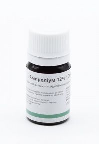 Склад 100 мл препарату:Ампролиум гідрохлорид - 12 г (еквівалентно 10,6 г ампролиума).Препарат має широкий спектр антикокцидийного дії, обумовлена подібністю хімічної структуриампролиума гідрохлориду з тіаміном, який необхідний для життєдіяльності кокцидій.Ампролиум гідрохлорид пригнічує розвиток кокцидій на стадії шизогонией першої і другої генерації.При оральному застосуванні швидко всмоктується та поширюється в тканинах протягом 1 - 4:00, швидко виводиться з організму (в основному через кишечник птиці, в незначній кількості нирками).Показання до застосування:Лікування і профілактика свійської птиці (курей-несучок, бройлерів, ремонтного молодняку птиці, індичок)при ураженні кокцидіозом, викликаним еймериями: E. tenella, E. necatrix, E. acervulina, E. adenoeides, E. maxima,E. brunetti, E . mitis, E. gallopavonis, E. meleagrimitis, які чутливі до ампролиуму. Спосіб застосування та дози: Препарат застосовують з питною водою в дозах: як основний препарат для лікування (при помірній ступеня ураження): 50 мл препарату 50 л питної води, 5-7 днів як основний препарат для лікування (при значній ступені ураження): 50 мл препарату 25 л питної води, 5-7 днів для підтримуючого лікування (після лікування для попередження реінфекції): 50 мл препарату на 100 л питної води, 1 - 2 тижні для профілактики: 50 мл препарату на 100 л питної води, в період ризику зараження.При застосуванні препарату птахам дають тільки воду з ліками замість питної води.