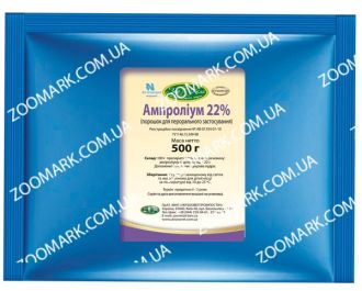 АМПРОЛІУМ 22 (порошок для перорального застосування)листівкавкладкаОписПорошок білого або жовтуватого кольору без запаху.Склад100 г препарату містять діючу речовину:ампроліуму гідрохлорид - 22 г.Допоміжні речовини: цукрова пудра.Фармакологічні властивостіATCvetQP51, антипротозойні ветеринарні препарати (QP51AX09, ампроліум)Активнодіюча речовина препарату, ампроліуму гідрохлорид, пригнічує розвиток еймерій на стадії шизогонії першої та другої генерації.Дія ампроліуму зумовлена тим, що його хімічна структура близька до тіаміну (вітаміну В1), необхідного для життєдіяльності еймерій. У клітинах паразитів ампроліум порушує вуглеводний обмін, що призводить до їх загибелі.Ампроліум майже не проникає через клітинні мембрани слизової оболонки кишечнику птиці і ссавців, тому препарат практично нетоксичний при використанні у терапевтичних дозах. Основна частина ампроліуму (до 97) виводиться з організму у незміненому вигляді. Препарат не пригнічує формування протикокцидійного імунітету, сумісний з вітамінами і кормовими добавками, які застосовуються у птахівництві.ЗастосуванняПрофілактика та лікування курей, індиків та кролів при ураженні еймеріями:у курей-Eimeria tenella, E. necatrix, E. acervulina , E. praecox,E. maxima,E. brunetti, E.mitis, E.mivatiу індиків- Eimeria adenoides, E.gallapavonis, E. meleagrimitisу кролів- Eimeria stiedae, E. perforans, E. magna.ДозуванняПрепарат згодовують з кормом або випоюють з питною водою:Вид тваринПрофілактична дозаЛікувальна дозаКури1,4 г2 л води або1,4 г2 кг корму протягом 3-5 діб1,4 г1 л води або 1,4 г 1 кг корму протягом 3-5 дібІндики1,4 г2 л води або1,4 г2 кг корму протягом 3-5 діб1,4 г1 л води або 1,4 г 1 кг корму протягом 3-5 дібКролі1,4 г20-25 кг маси тілапротягом 14 діб1,4 г5-10 кг маси тіла протягом 3-5 діб, однократно на добуПротипоказанняПідвищена чутливість до ампроліуму, хвороби печінки, ниркова недостатність.ЗастереженняЗабій кролів та птиці на мясо дозволяють через 5 діб після останнього застосування препарату. При забої до вказаного терміну мясо згодовують непродуктивним тваринам або утилізують залежно від висновку лікаря ветеринарної медицини.Персонал, який працює з препаратом, повинен дотримуватись основних правил гігієни та безпеки, прийнятих при роботі з ветеринарними препаратами.Під час роботи з препаратом не курити, не пити та не приймати їжу. Після закінчення роботи ретельно вимити руки і обличчя з милом, рот прополоскати водою. Тару з-під препарату забороняється використовувати для харчових цілей.Форма випускуДвошарові пакети або банки з полімерних матеріалів по 1,4 10,0, 100,0 та 500,0 г.ЗберіганняУ сухому і захищеному від світла місці за температури від 10 до 25 C.Термін придатності -2 роки.