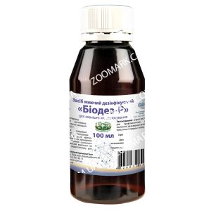 Засіб миючий дезінфікуючий Біодез-PФорма випускуПолімерні флакони:100 мл, 250 мл, 1 лКаністри:5 лСклад100 г препарату містить діючу речовину: полігексаметиленгуанідин гідрохлорид - 20 г.Фармакологічні властивостіПрепарат має бактерицидну дію щодо грампозитивних та грамнегативних бактерій, (Escherichia coli, Staphylococcus aureus, Streptococcus faecalis, Shigella sonnei, Shigella flexneri, Salmonella thyphimurium, Pseudomonas aeruginosa, Pseudomonas vulgaris, Klebsiella pneumoniae, Bacillus subtilis тощо), туберкулоцидну, фунгіцидну (Aspergillus niger, Aspergillus flavus, Candida albicans, Trichophyton gypseum тощо), а також віруліцидну (Myxomatosis virus, Newcastle disease virus, Coronaviridae, Parvoviridae, Herpes virus тощо) дії.Полімерна природа препарату забезпечує утворення на оброблених поверхнях полімерної плівки, яка довго зберігається, що забезпечує пролонгований біоцидний ефект.ЗастосуванняПрепарат застосовується для дезінфекції тваринницьких та птахівничих приміщень, забійних та мясопереробних цехів, транспортних засобів, інвентарю, тари, спецодягу, поверхонь та інших обєктів і обладнання, які підлягають ветеринарному нагляду.Препарат призначений для профілактичної, поточної та заключної дезінфекції за відсутності та в присутності тварин і птиці.Приготування робочих розчинівРобочі розчини препарату готують у промаркованих ємностях із будь-яких матеріалів шляхом розведення засобу водою при перемішуванні до повного його розчинення. При отриманні робочих розчинів воду бажано підігріти до 50-60С.Для приготування робочих розчинів препарату користуються розрахунками, наведеними у таблиці:Концентрація розчину, по діючій речовиніДля приготування 1 л розчинуПрепарат, млВода, мл0,159950,1689920,2512,5987,50,5259751,0509502,0100,0900,04,0200800Концентрація розчину, по діючій речовиніДля приготування 10 л розчинуПрепарат, млВода, мл0,15099500,168099200,2512598750,525097501,050095002,0100090004,020008000ДозуванняДезінфекцію розчинами препарату проводять після ретельної механічної та санітарної очистки поверхонь обєктів знезараження.ОбєктидезінфекціїКонцентрація робочого розчину, по ДРЕкспозиція,хвилинСпосібдезінфекціїКількість роб. розчину, млм2Профілактична та вимушена дезінфекція при бактеріальних інфекціях0,1-0,2530-60Обприскування або протирання100-300Профілактична та вимушена дезінфекція при бактеріальних інфекціях на санбойнях мясокомбінатів та інших санітарно-забійних пунктах0,5-1,0120Обприскування або протирання100-300Дезінфекція при туберкульозі, вірусних та грибковихінфекціях2,0-4,0120Обприскування або протирання250-300Після закінчення встановленої експозиції доступні для тварин поверхні, годівниці, поїлки, інші місця, а також поверхні оброблених обєктів, що контактують з сировиною і готовою продукцією, ретельно промивають водою.В якості дезінфікуючого засобу та як антимікробну, фунгіцидну добавку для довготривалого протигрибкового захисту виробничих, санітарно-побутових і підсобних приміщень при застосуванні водоемульсійних фарб і вапняних розчинів рекомендується застосовувати в концентрації 0,2 по діючій речовині. Необхідну кількість засобу Біодез-Р розчиняють у воді і вносять у водоемульсійну фарбу або у вапняні розчини, ретельно перемішують і обробляють стіни і стелі звичайним методом (щіткою, пульверизатором). Після підсихання наносять другий шар фарби або вапняного розчину з засобом Біодез-Р.ЗастереженняЗасіб несумісний з милами, аніонними поверхнево- активними речовинами та сильними окиснювачами.ПротипоказанняН