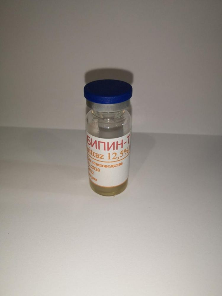 Біпін-Т - для лікування і профілактики бджолосімей від вароатозу. Препарат абсолютно безпечний для бджіл, маток і розплоду.Склад і форма випуску:Містить діючу речовину: амітраз -12,5 . Являє собою прозору рідину з жовтуватим відтінком зі специфічним запахом. Розфасована в скляні ампули по 0,5 мл (10 доз).Фармакологічні властивості:Препарат з яскраво вираженим акарицидну дію проти кліщів.Застосування:Біпін-Т застосовують для лікування вароатозу бджіл у весняний і осінній періоди, при відсутності розплоду в сімях бджіл. Ампулу 0,5 мл розводять в 1 л теплої води, до отримання рівномірної емульсії молочного кольору, потім її набирають у шприц і поливають тонкою цівкою знаходяться у вуличках пчл з розрахунку 10 мл на одну вуличку. Обробку проводять 2-х кратно з інтервалом 7 днів. Перша обробка відразу після закінчення медозбору і відкачування меду, а друга перед постановкою сімей на зимівлю (при наявності на дорослих бджіл кліщів вароа).Побічні дії:Не виявлено.Протипоказання:Не слід обробляти сімї силою менше 4-5 вуличок.Особливі вказівки:Мед зібраний після обробки Бипином-Т використовують у їжу без обмежень.Умови та термін зберігання:в сухому, темному місці, при температурі від 0С до 30С. Термін зберігання 2 роки з дня виготовлення.