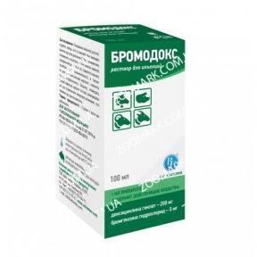 ОПИСРідина від жовто-коричневого до темно-коричневого кольору із специфічним запахом складовихСКЛАД1 мл препарату містить діючі речовини:доксициклін гіклат 200,0 мг,бромгексин гідрохлорид 5,0 мг.ФАРМАКОЛОГІЧНІ ВЛАСТИВОСТІАТС vet класифікаційний код QJ01 антибактеріальні ветеринарні препарати для системного застосування.Бромодок комбінований препарат, в склад якого входять доксициклін і бромгексин.Доксициклін бактеріостатичний антибіотик, який належить до групи тетрациклінів. Діє на рибосоми бактерій, заважаючи білковому синтезу. Препарат має широкий спектр антимікробної дії щодо грампозитивних та грамнегативних бактерій (Staphylococcus spp., Diplococcus pneumoniaе, Streptococcus spp., Haemophilus influenza, E. coli, Pneumococci, Bacillus antracis, Clostridium tetani, Clostridium perfringes, Listeria monocytogens, Actinomyces spp., Entirobacter spp., Klebsiella spp., Salmonella spp., Shigella spp., Yersinia spp.), а також мікоплазм (Mycoplasma spp.), ріккетсій (Rickettsia spp.) і хламідій (Chlamydia spp.).Бромгексин викликає муколітичний (секретолітичний) і відхаркувальний ефекти. Муколітичний ефект повязаний з деполімеризацією та розрідженням мукопротеїнових і мукополісахаридних волокон, поліпшує виділення мокроти, таким чином полегшуючи дихання. Однією з важливих особливостей дії бромгексину є його здатність стимулювати утворення поверхнево-активного вещества суміші поверхнево-активних речовин ліпідо-білково-мукополісахаридної природи, яка синтезується в клітинах альвеол. Біосинтез поверхнево-активного вещества порушується при різних захворюваннях органів дихання, викликаних Mycoplasma gallisepticum, Mycoplasma synoviae, Ornithobacterium rhinotracheale. Це призводить до порушення стабільності альвеолярних клітин, послаблення їх реакції на неблагоприятні впливи.При комбінованому застосуванні доксицикліну з бромгексином підвищується концентрація антибіотика в секреті верхніх дихальних шляхів та в мокроті, прискорюється його всмоктування, завдяки чому досягається високий рівень доксицикліну в крові протягом тривалого часу і прискорюється процес одужання. Доксициклін практично не метаболізується і виводиться з організму переважно з фекаліями у вигляді неактивних комплексів та в меншій мірі з сечею.ПОКАЗАННЯ ДО ЗАСТОСУВАННЯЛікування великої рогатої худоби, овець, кіз та свиней при захворюваннях органів дихання (бронхопневмонія, пневмонія, ензоотична пневмонія свиней, атрофічний риніт і ін.), шлунково-кишкового тракту (колібактеріоз, сальмонельоз), а також хворих на кератоконюнктивіт, копитну гниль, стафілококоз, рожу, хламідіоз, раневі інфекції, артрит і інші захворювання, викликані мікроорганізмами, чутливими до доксицикліну.СПОСІБ ЗАСТОСУВАННЯ ТА ДОЗИВнутрішньомязово одноразово в дозі:велика рогата худоба, овці, кози 1,0 мл препарату на 10 кг маси тіла тваринисвині 0,5-1,0 мл препарату на 10 кг маси тіла тварини.При необхідності повторна інєкція тваринам можлива лише через 48 годин після першої інєкції.У звязку з можливим місцевим набряком та болісною реакцією при введенні препарату в обємі, що перевищує 2,5 мл для поросят та ягнят, дорослих свиней, овець і телят 5,0 мл, для великої рогатої худоби 10 мл, рекомендується введення препарату в кілька місць.ПРОТИПОКАЗАННЯПідвищена чутливість до складових компонентів препарату.Не застосовувати тваринам при важких порушеннях функції нирок і печінки.Не застосовувати одночасно з антибіотиками групи пеніцилінів, цефалоспоринів, а також кальційс
