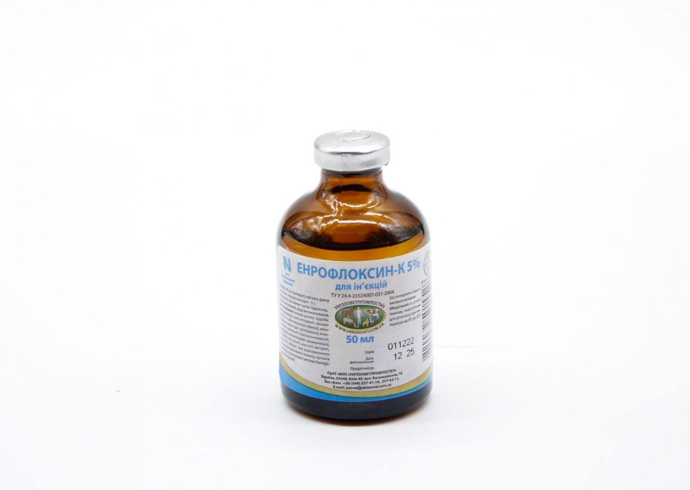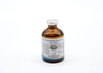 Склад100 мл препарату містить діючу речовину: енрофлоксацин - 5 р.Фармакологічна діяПрепарат належить до групи фторхінолонів. Гальмує активний фермент гіразу, яка бере участь у синтезі ДНК мікробної клітини, в результаті чого настає швидке бактерицидну дію, особливо на мікроорганізми, резистентні до бета-лактамних антибіотиків, тетрациклінів, макролідів і аміноглікозидів.Препарат ефективний проти грамнегативних і грампозитивних мікроорганізмів: Е. coli, Salmonella spp., Campylobacter spp., Haemophilus spp., Pasteurella spp., Bordetella spp., Erysipelothrix rhusiopathiae, Klebsiella spp., Staphylococcus aureus, Streptococcus spp. а також Mycoplasma spp.ЗастосуванняВелика рогата худоба:лікування тварин, хворих колидиареей, колисептицемией, сальмонельоз, стафілококову інфекцію, мікоплазмоз, спричинені мікроорганізмами, чутливими до енрофлоксацину.Свині:лікування тварин, хворих пастерельозом, ензоотической пневмонією, бронхопневмонией, колидиареей, колисептицемией, сальмонельоз, атрофичним ринітом, мастит, метрит, агалактией, викликані мікроорганізмами, чутливими до енрофлоксацину.Собаки: лікування тварин при захворюваннях шлунково-кишкового каналу, органів дихання, сечостатевої системи бактеріальної етіології, спричинених мікроорганізмами, чутливими до енрофлоксацину.ДозировкаПодкожно или внутримишечно:крупний рогатийскот -1,0 мл на 20 кг масси тела 1 раз в сутки на протяжении 2-3 сутоксобаки (подкожно) - 1,0 мл на 10 кг масси тела 1 раз в сутки на протяжении 5-10 суток.Внутримишечно:свиньи- 1,0 мл на 20 кг масси тела 1 раз в сутки на протяжении 2-3 суток.При частих инфекциях дихательних путей, сальмонеллезе крупного рогатого скота и свиней дозу удваивают (1 мл на 10 кг масси тела) 1 раз в сутки на протяжении 5 суток.ПротипоказанняНе застосовувати тваринам з підвищеною чутливістю до енрофлоксацину, а також з ураженнями нервової системи та захворюваннями нирок.Забороняється застосовувати собак дрібних порід в перші 12 місяців життя, великим породам в перші 18 місяців життя, вагітним сукам і свиноматкам, а також сукам в період лактації. Не застосовувати коням.Не застосовувати одночасно з препаратами тетрациклінового ряду, макролідами (еритроміцин), хлорамфеніколом, теофіліном.ЗастереженняУбой животних на мясо разрешается: крупний рогатий скот - через 7 дней после последнего введения препарата, свиньи - через 5 дней после последнего введения препарата. Употребление молока в пищу людям разрешается через 4 дня после последнего введения препарата. Полученное к указанному сроку мясо и молоко утилизируют или скармливают непродуктивним животним, в зависимости от заключения врача ветеринарной медицини.Форма випускаСтеклянние флакони, закритие резиновими пробками под алюминиевую обкатку по 10, 50 и 100 мл.ЗберіганняСухе, темне, недоступне для дітей місце при температурі від 8С до 25С. Список Б.Термін придатності- 3 роки.