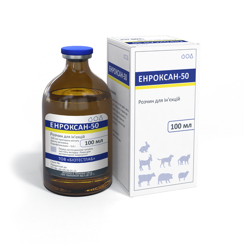 склад100 мл препарату містять діючу речовину енрофлоксацин 5,0 г, допоміжні речовини.Фармакологічні властивостіЕнрофлоксацин це антибіотик групи фторхінолонів III покоління, він пригнічує синтез ДНК в ядрах клітин мікроорганізмів, діє бактерицидно проти грампозитивних та грамнегативних мікроорганізмів (Staphylococcus aureus, Enterobacteriaceae spp., Pasteurella spp., Haem. , Bordetella bronchiseptica, Pseudomonas aeruginosa, Salmonella spp. та ін., а також діє проти мікоплазм (Mycoplasma spp.) та хламідій (Chlamydia spp.).ЗастосуванняЛікування великої рогатої худоби, овець, кіз, свиней, собак, котів та кроликів при захворюваннях органів дихання та травного тракту, спричинених мікроорганізмами, чутливими до енрофлоксацину.