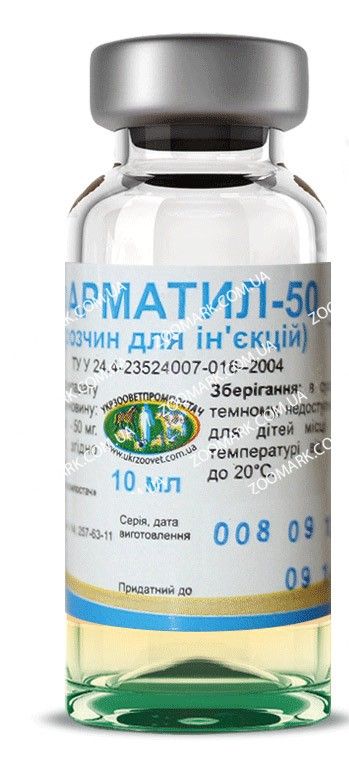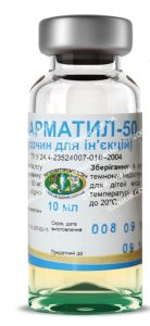 ФАРМАТИЛ-50(розчин для інєкцій)листівка-вкладкаОписПрозорий розчин жовтуватого кольору.Склад1 мл препарату містить діючу речовину:тилозину тартрат - 50мг.Допоміжні речовини: пропіленгліколь, спирт бензиловий, метилпарабен, пропілпарабен, вода високоочищена.Фармакологічні властивостіАТС vet класифікаційний кодQJ01-антибактеріальні ветеринарні препарати для системного застосування,QJ01FA90- Тилозин.Тилозин - макролідний антибіотик, який пригнічує бактеріальний синтез протеїнів внаслідок звязування активної речовини з 50S субодиницями рибосом. Препарат діє бактеріостатично на грампозитивні (Actinomyces spp., Bacillus antracis, Сlostridium spp., Corynebacterium spp., Erysipelothrix rhusiopathiae, Streptococcus spp.) і грамнегативні мікроорганізми (Actinobacillus spp., Bordetella bronchiseptica, Fusobacterium spp., Haemophilus spp., Moraxella spp., Pasteurella spp., Proteus mirabilis, Salmonella spp.), а також мікоплазми (Mycoplasma gallisepticum, M. hyopneumoniae, M. synoviae, M. meleagridis, M. agalactiae, M. Bovigenitalium).При внутрішньомязовому введенні антибіотик резорбується швидко і досягає максимальних концентрацій у тканинах організму приблизно через 1 годину після введення. Терапевтичний рівень антибіотика в тканинах зберігається протягом не менше 20 годин. Тилозин виводиться з організму переважно з сечею і молоком.ЗастосуванняВелика рогата худоба: лікування тварин, хворих на пневмонію, мастит, пневмоентерит, вторинні інфекції, при вірусних захворюваннях, що спричинені мікроорганізмами, чутливими до тилозину.Вівці, кози:лікування тварин, хворих на бронхопневмонію, інфекційну агалактію, вторинну інфекцію при вірусних захворюваннях, що спричинені мікроорганізмами, чутливими до тилозину.Свині: лікування тварин, хворих на ензоотичну пневмонію, артрит, дизентерію, вторинні інфекції при вірусних захворюваннях, атрофічний риніт, що спричинені мікроорганізмами, чутливими до тилозину.Собаки, коти: лікування тварин при захворюваннях травного каналу та органів дихання, що спричинені мікроорганізмами, чутливими до тилозину.Кролі: лікування тварин при захворюваннях травного каналу та органів дихання, що спричинені мікроорганізмами, чутливими до тилозину.Індики: лікування птиці при захворюваннях органів дихання, що спричинені мікроорганізмами, чутливими до тилозину.ДозуванняВнутрішньомязово одноразово у дозіВиди тваринДоза препарату (мл препарату на 1 кг маси тіла тварин)Велика рогата худоба.0,1Вівці, кози0,2-0,24Свині0,2Собаки, коти0,04-0,2Кролі0,24-0,3Індики0,1-0,2Курс лікування 3-5 діб.ПротипоказанняПідвищена чутливість до тилозину.Не застосовувати одночасно з пеніцилінами, цефалоспоринами і лінкоміцином.Не застосовувати тваринам з порушенням функції печінки та нирок.Препарат не застосовувати коням.ЗастереженняЗабій тварин на мясо дозволяють через 8 діб після останнього застосування препарату. Споживання молока дозволяють через 4 доби після останнього введення препарату. Отримане, до зазначеного терміну, мясо та молоко утилізують або згодовують непродуктивним тваринам, залежно від висновку лікаря ветеринарної медицини.Тваринам в період вагітності препарат не застосовують. У перший тиждень життя тваринам препарат не призначають.Форма випускуФлакони зі скла закриті гумовими корками під алюмінієву обкатку по 10, 50, 100 мл.ЗберіганняСухе, темне, недоступне для дітей місце при температурі від 10С до 20С.Термін придатності 2 роки.