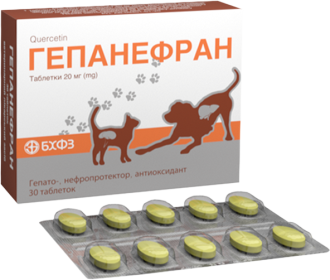 ГепанефранДіюча речовина:кверцетин 20 мг.Фармакологічні властивості Гепанефрану обумовлені вираженою антиоксидантною активністю кверцетину.Завдяки якій, разом з мембраностабілізуючою дією, виявляються гепатопротекторний, нефропротекторний та нтитоксичний ефекти.Препарат також має протизапальну, гастропротекторну, радіопротекторну та кардіопротекторну дії.Показання до застосуванняУ комплексному лікуванні гепато-, нефропатологій та загальної інтоксикації у собак та котів.Лікарська форма, упаковка:таблетки по 20 мг, по 10 таблеток у блістері, по 3 блістери у пачці.