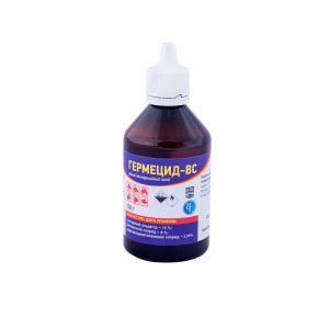 Дезінфікуючий засіб Гермецид VSСвітло-жовта, прозора, однорідна, мало-вязка рідина з характерним запахом без сторонніх включень.При зберіганні допускається невеликий осад.складРечовини, що діють:дидецилдиметиламоній хлорид 2,25глутаральдегід 15бензалконію хлорид 8.Допоміжні речовини: поверхнево активні речовини (ПАР), ортофосфорна кислота, вода.ВластивостіПрепарат не містить формальдегід, хлор та фенол.Завдяки 3 активним інгредієнтам має широкий протимікробний спектр впливу проти різних типів мікроорганізмів: бактерій, вірусів, грибків.Активний у твердій воді та ефективний у будь-яких умовах, у тому числі в умовах забруднення.Економічний у використанні, має противірусний ефект вже при 0,5 концентрації.Відмінно піниться, добре зволожує поверхню.Має тривалу дію та не викликає звикання мікроорганізмів, що гарантує стабільний результат дезінфекції.Препарат може використовуватися у присутності тварин та безпечний для навколишнього середовища.Препарат біорозкладається.ЗастосуванняЗастосовується на птахофабриках, свинокомплексах та тваринницьких фермах, підприємствах харчової промисловості, комбікормових заводах, сільськогосподарських та комунальних господарствах, ветеринарних клініках, у місцях громадського харчування для дезінфекції обладнання, інкубаторів, забійних цехів, холодильних камер, систем вентиляції, приміщень, стіни, стелі, а також для дезінфекції одягу, взуття та автотранспорту, перевезення тварин, зерно, комбікорм, продукти харчування.Препарат застосовується методом аерозольного розпилення у вигляді гарячого туману шляхом нанесення піни, холодного аерозольного розпилення, дрібно-краплинного зрошення.Також може застосовуватись методом ручної обробки.ДозуванняРобочі розчини готують шляхом додавання відповідних кількостей водопровідної води.При розрахунку концентрації робочих розчинів засіб приймають за 100 речовину.Для профілактичної дезінфекції проти мікобактерій туберкульозу, кишкової палички, сальмонели, синьогнійної палички, золотистого стафілококу використовують робочий розчин 0,1 0,25 (з витратою 0,1 0,5 лм2) експозиція 30-40 хвилин.Для вимушеної дезінфекції проти інфекційних захворювань та вірусів використовують робочий розчин 0,5 (з витратою 0,3 лм2, нанесення піни 0,2 лм2) експозиція 60 хвилин.Для вимушеної дезінфекції проти особливо небезпечних хвороб (пташиного грипу, класичної та африканської чуми свиней, вірусу Тальфана, хвороби Ауески, вірусу ящуру, вірусу Ньюкасла, вірусу контагіозного гепатиту собак, інфекційної анемії курчат, інфекційних інфекцій. ,5 1,0 (з витратою 0,3 0,5 лм2, нанесення піни 0,1 0,3 лм2) експозиція 60 хвилин.Для профілактичної, вимушеної, заключної дезінфекції методом туманоутворення (аерозольного розпилення) використовують робочий розчин (1 л Гермецид-ВС додають 3 л води на 1000 м3 обєму кімнати) експозиція не менше 3-х годин.Для санації приміщення у присутності тварин та птахів рекомендується використовувати механічний аерозольний генератор холодного туману.Обробку слід проводити 0,5 розчином препарату Гермецид-ВС.Норма витрати 2 5 мл робочого розчину на 1 м3.Для поліпшення поширення туману в робочий розчин можна вводити гліцерин із розрахунку 5-10 від загального обсягу.Обробку слід проводити при вимкненій вентиляції.У разі неможливості повного відключення вентиляції або ст