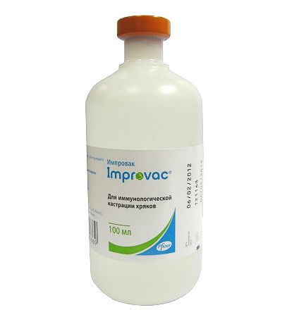 I. Загальні сведенияТорговое найменування лікарського препарату: Импровак (Improvac).Міжнародна непатентована назва: гонадолиберин, конюгований з дифтерійним анатоксином.Лікарська форма: розчин для інєкцій.Импровак в одній дозі (2 мл) в якості діючої речовини містить гонадолиберин - 0,4 мг допоміжні компоненти: ДЭАЭ-декстран -300 мг, тиомерсал - 0,2 мг, сечовину - 4 мг і воду для інєкцій до 2 мл По зовнішньому вигляду препарат являє собою прозорий, білуватого кольору розчин.Импровак випускають розфасованим по 100 мл у полімерні флакони відповідної місткості, закупорені гумовими пробками, укупоренними алюмінієвими ковпачками.Зберігають препарат у закритій упаковці виробника в сухому, захищеному від прямих сонячних променів місці, окремо від продуктів харчування та кормів, при температурі від 2С до 8С.Термін придатності лікарського препарату при дотриманні умов зберігання в закритій упаковці - 39 місяців з дня виробництва. Після відбору з флакона частини препарату, за умови дотримання правил асептики, його можна використовувати багаторазово, протягом не більше 28 днів.Лікарський препарат забороняється застосовувати після закінчення терміну придатності.Препарат слід зберігати в місцях, недоступних для дітей.Невикористаний лікарський препарат утилізується у відповідності з вимогами законодавства.II. Фармакологічні свойстваФармакологическая група: гормони та їх антагоністи.Гонадолиберин - рилізинг-гормон гіпоталамуса. Він стимулює вироблення нейтралізуючих антитіл проти гонадотропін-рилізинг гормону, що забезпечує розвиток і функціонування тестикулів у кнурів. Найбільш високий титр антитіл, що нейтралізують ендогеннийрилизинг-гормон, що утворюється через 10-14 днів після другої інєкції препарату.У статевозрілих тварин блокада освіти лютеїнізуючого та фолікулостимулюючого гормонів призводить до супресії функції тестикулів та їх регресії.Импровак за ступенем впливу на організм відноситься до малонебезпечних речовин (4 клас небезпеки за ГОСТ 12.1.007-76).III. Порядок примененияИмпровак застосовують для імунологічної кастрації кнурців з метою запобігання неприємного запаху мяса і придушення агресивної поведінки.Застосування препарату протипоказане хворим і ослабленим тваринам, а також при підвищеній чутливості тварин до компонентів препарату.Забороняється застосування препарату кнурам-плідникам до завершення їх використання у відтворенні.Импровак вводять свиням підшкірно, за вухо.Препарат застосовують з інтервалом не менше 4-х тижнів, починаючи з 2-місячного віку. Друге введення препарату проводять через 4-6 тижнів до забою.Симптоми передозування у тварин не виявлено.Особливостей дії лікарського препарату при його першому введенні та при його скасування не встановлено.Слід уникати пропусків введення чергової дози препарату, так як це може призвести до зниження терапевтичної ефективності. В случае пропуска одной дози необходимо ввести ее как можно скорее, далее интервал между введениями препарата не изменяется.Побочних явлений и осложнений при применении Импровака в соответствии с настоящей инструкцией у сельскохозяйственних животних, как правило, не наблюдается.В редких случаях у отдельних животних возможно образование незначительного отека на месте введения препарата, которий постепенно исчезает.Взаимодействия