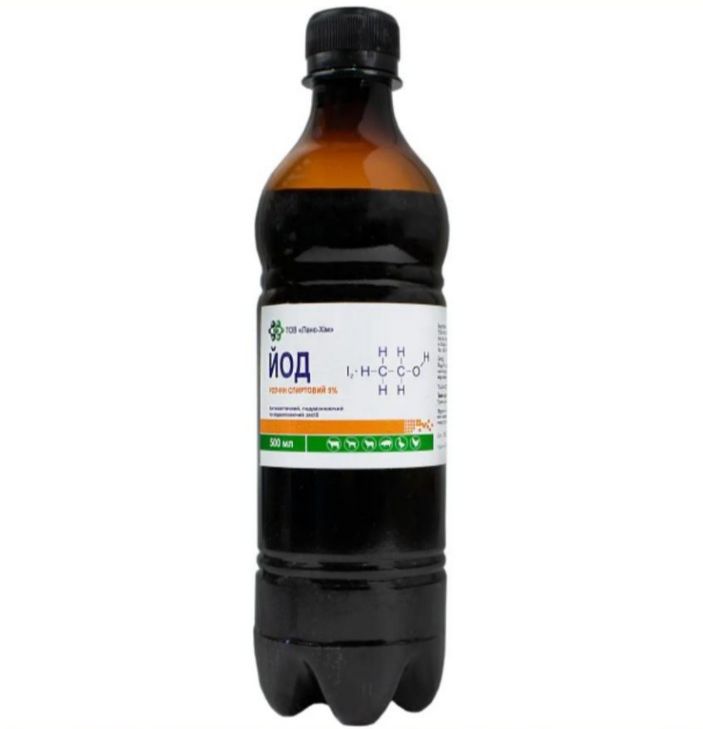 Антисептичний Розчин йоду спиртового 5Ланс-хімПрепарат являє собою однорідну рідину від червоно-бурого до темно-коричневого кольору зі специфічним запахом. Розчин йоду антисептичний, дратівливий і відволікальний засіб. Має широкий спектр антибактеріальної дії щодо доStaphylococcusspp., Streptococcus spp., Neisseria spp., Escherichia coli, Shigella spp., Klebsiella spp., Proteus spp., Chlamydia, несперечних анаеробів, вірусів герпесу та вітряної оспи (Herpesviridae). Йод проникає в карту бактерії через дифузію, порушуючи життєво важливі реакції протоплазми, призводить до її загибелі. У місці нанесення розширюються судини, стінки їх набрякають, стають легко проникними. Застосовується в ветеринарії для таких видів тварин, як-от:Велика рогата тварина, коні, вівці, кози, свині, собаки, кішки, собаки. Використовується дляпришвидшення загоєння свіжих ран у разі гангренозного мокроцвіту, трихофітії, дерматомікозу, флегмоне, дерматиту. Слугує кровоспинним, протимікробним засобом, а все завдяки чинним речовинам, як-от: йод, калій йодид і етиловий спирт.Переваги дезінфікувального препарату на основі йоду та спирту етилового5Широкий спектр антибактеріальної діїЕфективно протинесперечних анаеробів, вірусів герпесу та вітряної віспиПришвидшує загоєння свіжих ранЗастосовується для широкого спектра тварин, від хатніх котів до великої рогатої худобиМає кровоспинні властивостіЗручна форма випуску засобу100 ефективність засобуІнструкція, спосіб застосування, норма витрати, дозування та склад Розчину йоду спиртового 5 500 мл Ланс-ХімАктивні речовини: йод 25 г, калій йодид, спирт етиловий 96, вода очищенаРозчин йоду спиртовий 5 застосовують зовнішнє. Під час оброблення ран зони шкіри змащують по краях рани марлевими тампонами, змоченими в розчині, не наносячи його безпосередньо на рану. Обробляють двічі на добу до одужання, але не більш ніж 7 діб. Оброблення операційного поля виробляють двічі, на початку та наприкінці операції. Шкіру в місцях інєкцій двічі протирають стерильним марлевим тампоном, змоченим у засобі. Для відволікальної дії препарат наносять на шкіру у формі сітки.Під час роботи з розчином йоду 5 треба дотримуватися загальних правил особистої гігієни та техніки безпеки, передбачених під час роботи з лікарськими препаратами. Після закінчення роботи руки треба вимити теплою водою з милом. У разі випадкового контакту лікарського препарату зі шкірою або слизовими оболонками ока, негайно промити їх великою кількістю води. У разі алергічних реакцій або у разі випадкового потрапляння препарату в організм людини треба негайно звернутися до медичного закладу