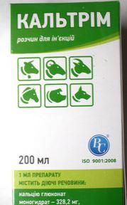 ОписРідина від безбарвного до світло-жовтого кольору, практично без запаху.Склад1 мл препарату містить діючі речовини (мг):кальцію глюконат моногідрат - 328,2 мгкальцію гліцерофосфат - 81,3 мгмагнію хлорид гексагідрат - 41,8 мг.Фармакологічні властивостіАТС -vet класифікаційний код: QA12CX99 інші препарати мінералів, комбінації.Кальцій сприяє передачі нервових імпульсів, скорочення гладкої і поперечно-смугастої мязової мускулатури, згортання крові, формування кісткової тканини, функціонування міокарда та інших систем і органів. Дефіцит іонів кальцію в тканинної рідини підвищує збудливість нервових вузлів, то може привести до тетанії. Крім того, впливає на колоїдний стан білків шляхом зниження їх дисперсії, що призводить до зменшення проникності кровоносних судин. Кальцій стимулює серцево-судинну систему і при внутрішньому введенні, симпатичну частину вегетативної нервової системи, збільшуючи вивільнення адреналіну, наявного в процесі згортання крові.Фосфор разом з кальцієм впливає на розвиток кісток і зубів, входить до складу фосфоліпідів, фосфопротеїнів, нуклеїнових кислот і багатьох коферментів. Фосфор стимулює процеси обміну, нормалізує рівень гормону стресу - кортизолу, прискорює утилізацію глюкози в крові і активізує енергетичний обмін, покращує функції печінки, підвищує неспецифічну резистентність організму, активізує рухову активність серцевого і скелетних мязів, сприяє утворенню кісткової тканини.Магній необхідний для активації багатьох ферментів, зокрема тих, які беруть участь у збереженні енергії у вигляді фосфатних сполук. Магній регулює вивільнення ацетилхоліну з рухових кінцевих пластинок, впливає на мязову збудливість.Рекомендації щодо застосуванняПрепарат застосовують для профілактики і лікування тварин при захворюваннях, викликаних порушенням обміну кальцію, фосфору і магнію в організмі:гіпольціемія (післяпологовий парез, рахіт у молодих тварин, остеомаляція у старих тварин)різні форми тетанії (транспортна і пасовищна тетанія, тетанія під час вагітності та лактації)алергія, токсикоз, післяпологова гемоглобінурія, плямиста хвороба, кропивянка, висип, геморагічний діатез, гематурія, міоглобінуріяпарез внаслідок дефіциту кальцію і фосфору різної етіологіїдопоміжна терапія при інтоксикації свинцем, фтором і щавлевої кислотою, особливо при зменшенні вмісту кальцію в кістках, рахіті, початкових стадіях запальних процесів різного походження, при кровотечі і гемморагічному діатезі, кропивниці, ревматичному запаленні, передпологових і післяпологових залежувань, післяпологових парезах, затримки посліду, декальцінаціі організму в період вагітності і лактації, при тетанії вагітних , еклапсіі у собак і свиноматок, а також при алергіях і токсикозах.Препарат застосовують для профілактики післяпологової гіпокальцимії і гідрофосфатеміі (післяпологовий парез) за 12 - 24 години до пологів і в першу добу після пологів.Спосіб застосування та дозиВид тваринКількість препарату (мл)Спосіб введенняспосіб введення80-100внутрішньовенновелика рогата худоба (масою тіла 500 -700 кг)80-215внутрішньовенно, внутрішньомязово або підшкірноМолодняк великої рогатої худоби (на 100 кг маси тіла)20-30внутрішньовенно, внутрішньомязово або підшкірноВівці, кози15-25внутрішньовенно, внутрішньомязово або підшкірноСвині15-25внутрішньове