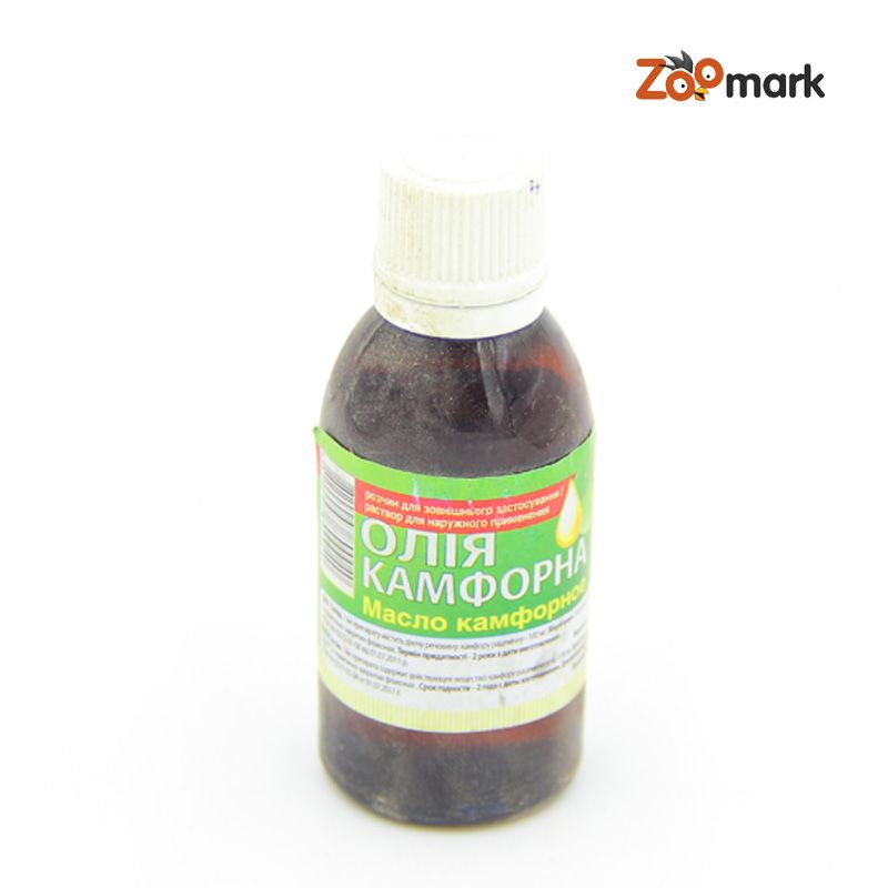 ОписПрозоре масло жовтого кольору з запахом камфори.Склад1 мл препарату містить:діюча речовина камфора 100 мгдодаткові речовини (рослинна олія) до 1 млФармакологічні властивостіПрепарат має виражену бактеріостатичну (особливо щодо кокова форм мікроорганізмів) і місцеве помірно подразнюючу дії. При нанесенні на шкіру викликає короткочасне відчуття холоду внаслідок подразнення спеціальних рецепторів (температура в місці застосування не знижується, а підвищується), відчуття холоду змінюється відчуттям тепла і знеболення. Діючи місцево, камфора викликає гіперемію шкіри, а при тривалій дії знижує чутливість нервових закінчень, уповільнює рух лейкоцитів і їх міграцію з кровоносних судин.Добре всмоктується шкірою і слизовими оболонками. При резорбції стимулює дихання і роботу серцево-судинної системи.Масло камфорне застосовується зовнішньо як протизапальний, болезаспокійливий та антисептичний засіб.ЗастосуванняЛікування великої рогатої худоби, коней, овець, кіз, свиней, собак, котів при різних захворюваннях шкіри. Рекомендується для лікування ревматичних захворювань мязів, гнійних тендовагінітів, флегмон, свищів, забоїв. Також використовується для захисту тварин у період активності гнусу.ДозуванняПрепарат застосовують зовнішньо, після гігієнічної обробки ураженої ділянки тіла шляхом втирання або нанесення за допомогою тампонів і аплікацій, від двох до чотирьох разів на добу до зникнення ознак захворювання.ПротипоказанняНе призначають тваринам, чутливим до камфори (молоді тварини бувають чутливими до камфори).ЗастереженняНе призначають тваринам перед забоєм на мясо.Форма випускуСкляні або пластикові флакони по 50, 100, 200, 500 мл і 1 л.ЗберіганняВ сухому, темному місці при температурі від 2 до 25 С.Термін придатності 2 роки.