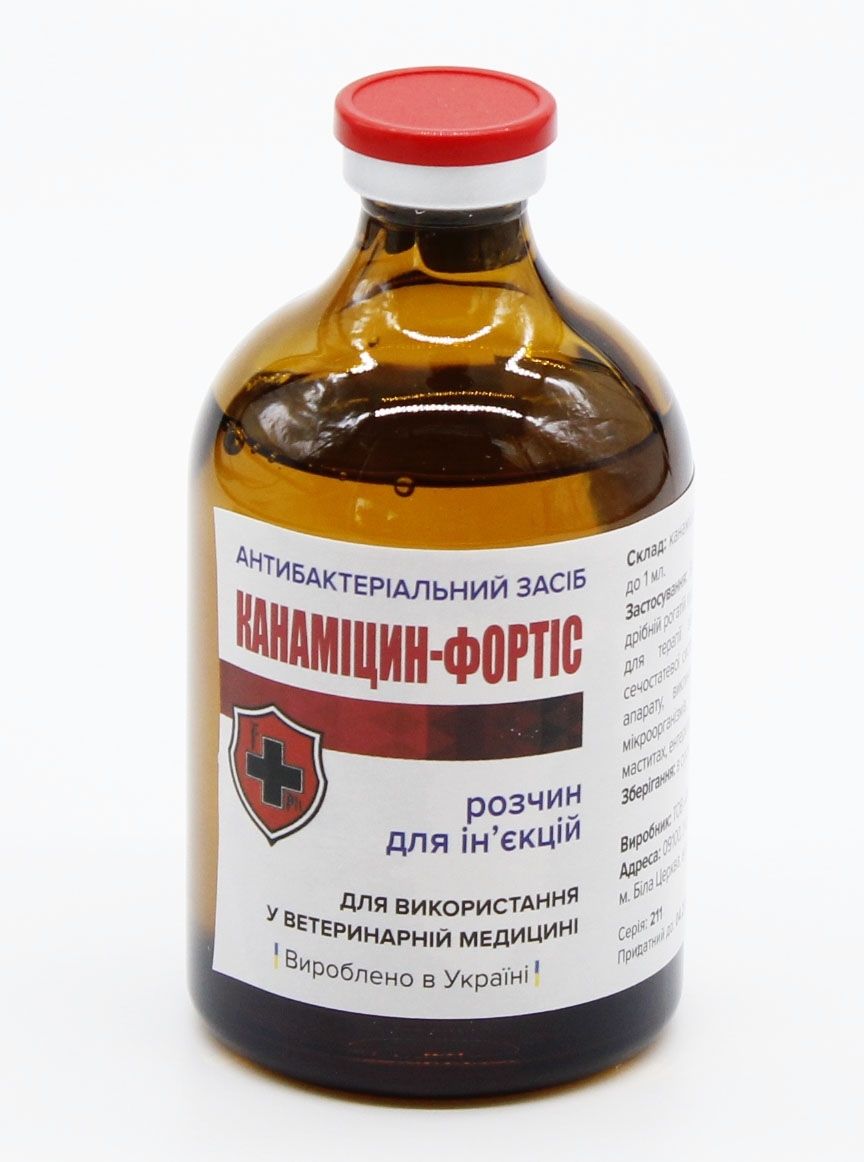 Опис: Розчин для інєкцій жовтого кольору.Склад: канаміцину сульфат - 250 мг, наповнювач - до 1 мл.Фармакологічні властивості: канаміцин - антибіотик групи аміноглікозидів. Активний щодо деяких грампозитивних (Staphylococcus spp.) і грамнегативних (Escherichia spp., Salmonella spp., Klebsiella spp., Haemophilus spp., Pseudomonas spp., Proteus mirabilis) мікроорганізмів. Канаміцин не активний щодо анаеробів і внутрішньоклітинних мікроорганізмів. Механізм дії канаміцину полягає в пригніченні синтезу структурних білків мікроорганізмів.Препарат характеризується високою біодоступністю. Після підшкірного або внутрішньомязового введення канаміцин швидко всмоктується з місця введення, виділяється майже в незміненому вигляді із сечею.Застосування: призначають великій і дрібній рогатій худобі, свиням, коням, собакам і котам для терапії захворювань респіраторної, травної, сечостатевої систем, мяких тканин і опорно-рухового апарату, що спричинені чутливими до препарату мікроорганізмами, зокрема у випадку бронтіхмоній тощо.Дозування: Канаміцин-Фортіс вводять один раз на добу підшкірно, внутрішньомязово або внутрішньовенно (повільно) у таких дозах:велика рогата худоба, коні - 2 мл на 100 кг маси тіладрібна рогата худоба, телята, свині - 2 мл на 50 кг маси тіласобаки, коти - 1 мл на 10 кг маси тіла.Курс лікування - 3-5 діб.індивідуальна непереносимість компонентів препарату. Не застосовувати паралельно з нефротоксичними препаратами та тваринами з порушеною функцією нирок.Каренція: мясо - 6 діб, молоко - 4 доби.Форма випуску: флакони 100 мл.Зберігання: у темному сухому місці за температури 10-25 С.Термін придатності: 3 роки.