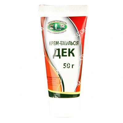 КРЕМ-ЕМУЛЬСІЯ ДЕК(крем-емульсія для зовнішнього застосування)листівка-вкладкаОписЕмульсія білого кольору зі слабким специфічним запахом.Склад100 г препарату містить діючі речовини:діоксидин - 0,1 гдекаметоксин - 0,1 гетоній - 0,5 гвітамін А - 0,26 млн. МОвітамін Е - 0,012 г.Допоміжні речовини: натрію тетраборат, емульгатор, олія вазелінова, гліцерин, вода високо очищена.Фармакологічні властивостіАТСvetкод QD, дерматологічні ветеринарні препарати (QD08AJ, четвертинні сполуки аммонію QG01AX99, інші протимікробні та антисептики, у комбініціях).Декаметоксин має широкий спектр антимікробної дії. Активний по відношенню до грампозитивних і грамнегативних мікроорганізмів:Staphylococcus spp., Streptococcus spp.з множинною стійкістю до антибіотиків до бактерій (Escherichia coli, Pseudomonas aeruginosa, Proteus vulgaris, Proteus morganiiта інші), дріжджеподібних грибів (Candida albicans, Candida cruseiі інші), найпростіших (Protozoaі інші), вірусів ряду дерматоміцетів (Trichophyton spp.,Microsporum spp.). Діє бактерицидно, спороцидно, фунгіцидно.Діоксидин - антимікробний засіб широкого спектру дії. Ефективний проти мікроорганізмів (Proteus vulgaris,Pseudomonas aeruginosa,Shigella spp.,Klebsiella spp.,Salmonella spp.,Staphylococcus spp., Streptococcus spp., Clostridium perfringens), які стійкі до інших хіміотерапевтичних препаратів, включаючи антибіотики.Етоній має бактеріостатичну і бактерицидну дії, активний по відношенню до стрептококів, стафілококів та інших мікроорганізмів (Staphylococcus spp., Streptococcus spp., Escherichia coliтa інші). Має детоксикуючу дію на стафілококові токсини. Діє місцевоанестезуюче, стимулює загоєння ран.Вітамін А - забезпечує нормальний обмін речовин в організмі, регулює функції клітинних і субклітинних мембран, посилює пластичні процеси, впливає на ріст і регенерацію епітеліальної тканини.Вітамін Е виконує роль антиоксиданту (нейтралізує вільні радикали), покращує мікроциркуляцію крові, укріплює стінки судин. Вплив його на мембранні структури позитивно позначається на стійкості та функціональній активності покривного епітелію слизових оболонок.ЗастосуванняПрофілактика та лікування у великої рогатої худоби, коней, овець, кіз, свиней, собак при маститах, ендометритах, проктитах, захворюваннях шкіри (дерматитах) та слизових оболонок, тріщинах сосків вимені, прямої кишки, опіках, ранах.ДозуванняЗовнішнньо.На ушкоджені місця крем-емульсію наносять тонким шаром 2-3 рази на добу.Внутрішньоматково.Профілактично - емульсію підігрівають до 38-39С і вводять за допомогою шприца Жане коровам у день отелення у дозі 100-200 мл. Через 24 години препарат вводять повторно у тій же дозі. З лікувальною метою вводять по 100-200 мл емульсії через кожні 24 годин протягом 4-5 діб.Ректально.Для лікування проктитів емульсію підігрівають до 38-39С і вводять за допомогою канюлі шприца собакам у дозі 3-5 мл. Лікувальний курс становить 5-7 діб. При необхідності курс лікування повторюють.Інтрацистернально. Емульсію підігрівають до 38-39С і вводять великій рогатій худобі за допомогою шприца з катетером у дозі 20 мл через кожні 12 годин протягом 5 діб. При необхідності курс лікування повторюють.ПротипоказанняПідвищена індивідуальна чутливість до компонентів препарату.ЗастереженняЗастосування молока в їжу людям дозволяють через 5 діб після повного одужання, але не раніше ніж через 4 доби після останнього інтрацистернального введення препарату. До зазначеного терміну молоко випоюють непродуктивним тваринам або утилізують залежно в