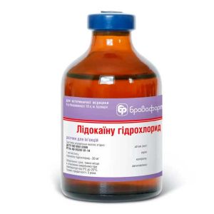 Склад1 мл препарату містить:лідокаїну гідрохлорид - 20 мгОписРідина безбарвна, прозора.Фармакологічні властивостіЛідокаїну гідрохлорид-похідна ацетаніліду, належить до групи аміноамідних засобів для місцевої анестезії, які позбавляють больової чутливості обмежену ділянку тіла. Дія полягає в стабілізації нейрональної мембрани, зниженні її проникності для іонів натрію, що перешкоджає проведенню імпульсів по нервових волокнах. Можливий антагонізм з іонами кальцію. Швидко гідролізується в слаболужному середовищі тканин і після короткого латентного періоду діє протягом 60-90 хвилин. Анестезуючу дію в 2-6 разів сильніше прокаїну, але знижується при тканинному ацидозі. Ефективний при всіх видах місцевого знеболювання, володіє помірними вазодилатаційними і седативними властивостями.При внутрішньомязовому введенні максимальна концентрація в крові досягається через 5-15 хвилин, анестезуюча дія починається через 2-5 хвилин і триває близько 90 хвилин. При місцевому застосуванні розчин всмоктується 7-20 хвилин, залежно від дози та місця нанесення. У плазмі крові звязується з білками на 50-80, метаболізується у печінці та виводиться через 4-5 годин нирками переважно у формі метаболітів.ПоказанняВеликій рогатій худобі, вівцям, козам, коням, свиням, собакам, котам для всіх видів місцевої анестезії (поверхнева, інфільтраційна, провідникова, епідуральна, спінальна, внутрішньосуглобова), блокади периферичних нервів, нервових сплетінь при больових синдромах і гострих запальних процесах.ПротипоказанняНе призначати тваринам з підвищеною чутливістю до лідокаїну та інших амідних лікарських засобів, під час вагітності, при тяжких кровотечах або інфікуванні місць можливої інєкції, захворюваннях серцево-судинної системи, порушеннях функції печінки, що супроводжуються зниженням печінкового кровотоку.Умови зберіганняВ упаковці виробника, в сухому, темному місці при температурі від +3 до +25 С.Після відкриття флакона препарат зберігати в холодильнику і використовувати протягом 10 діб.Термін придатності3 роки.