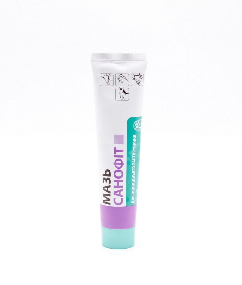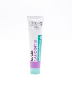 МАЗЬ САНОФІТлистівка-вкладкаОписОднорідна мазь від світло-зеленого до зеленого кольору зі специфічним запахом.Склад100 г препарату містять (г):хлорофіліпт - 5,0ефірну oлiю евкaлiпта - 3,22ефірну oлiю лaвpа - 1,21ефірну олію розмарину - 0,16ефірну олію кедра - 0,16кaмфopу - 0,16мeнтoл - 0,08.Допоміжні речовини: вазелін білий, масло вазелінове.Фармакологічні властивостіATC-vet класифікаційний код: QD02A Дерматологічні ветеринарні препарати. Препарати із захисною і помякшувальною дією.Завдяки комбінації діючих речовин препарат має aнтиceптичнy, пpoтизaпaльну i пpoтинaбрякову дії.Фармакологічна дія мазі, насамперед, обумовлена наявністю ефірних рослинних олій. Загальною властивістю їх є антисептична активність, що діє майже на всі групи мікроорганізмів (грампозитивні і грамнегативні коки, вібріони, віруси, найпростіші, мікроскопічні гриби). При тривалому застосуванні резистентність не розвивається. Це пояснюється руйнуючим впливом ефірних олій на цитоплазматичну мембрану, пошкодженням механізмів захисту і адаптації мікробної клітини. Антибактерійна активність олій лікарських рослин поєднується з цілковитою безпекою їх для макроорганізму.Хлорофіліпт має протизапальну, антисептичну дії, антибактерійну активність по відношенню до антибіотикостійких стафілококів, знімає набряки, стимулює процеси кровотворення, регенерації тканин, фагоцитарну активність лейкоцитів і клітин сполучної тканини.Камфора при місцевому застосуванні помірно подразнює нервові закінчення, при тривалій дії знижує чутливість рецепторів шкіри, зменшує міграцію лейкоцитів із судин у місце запалення. Діє бактеріостатично, особливо на кокові форми мікроорганізмів.Ментол підсилює місцеву дію рослинних ефірних олій, має заспокійливу, легку місцеву знеболювальну та антисептичну дії. При місцевому застосуванні звужує судини шкіри.Мазь швидко всмоктується в місцях нанесення, підсилює місцевий кровообіг, активізує живлення, сприяє загоєнню мікротравм. Захищає шкipy вимeнi вiд шкiдливиx впливiв нaвкoлишньoгo cepeдoвищa (холоду, вологи, вітру), а також від укусів комах. Запобігає висиханню шкіри при чacтому митті, має легкий дезінфікуючий ефект, надає пpyжнoсті, еластичності.ЗастосуванняМазь Санофіт застосовують зовнішньо місцево коровам, кобилам, вівцематкам, козам:- із профілактичною метою для попередження запальних процесів шкіри молочної залози, особливо при не дотриманні санітарно-гігієнічних вимог, порушенні правил машинного доїння- у комплексній терапії клінічно виражених форм субклінічного маститу (втирання мазі поєднують із масажем молочної залози тоді, коли масаж не є протипоказаним)- для відлякування комах від вимені при випасанні худоби у літніх таборах- змазування тріщин дійок, а також при обвітрюванні, дерматитах, сонячних опіках, обмороженні вимені- попередження інфікування шкіри та захисту від потрапляння мікрофлори через дійковий канал (галактогенний шлях проникнення мікробів при маститах) за утримання тварин на забрудненій підстилці- у комплексній терапії серозного набряку вимені, папілом дійок та вимені, гематом, абитих місць- для масажу сфінктера дійкового каналу при лакторемії (самовільному витіканні молока)- при алергічних проявах та зуді шкіри вимені при укусах комах- у комплексній терапії флeбiтів, паpафлeбiтів, лiмфaнгiтів, тeндинiтів.Мазь Санофіт застосов