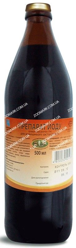 ПРЕПАРАТ ЙОДУ(Розчин для зовнішнього застосування)листок-вкладишОписРідина червоно-бурого кольору із специфічним запахом йоду.склад100 мл препарату містить:йод 5,0 гйодистий калій - 2,0 г.допоміжні речовини: водно-спиртова суміш.Фармакологічні властивостіАТСvet код QD08A, антисептики та дезінфектанти, (QD08AG03, йод).Діє антисептично, дратівливо та відволікаюче.Застосовують зовнішньо для обробки операційного поля, місць парентерального введення лікарських препаратів.Для більш глибокого проникнення йоду рекомендують шкіру заздалегідь знежирити мильним розчином.Препарат діє антимікробно, кровоспинно, прискорює загоєння ран при свіжих пораненнях, травмах, фурункульозах, норицях.Діє дратівливо при хронічних запаленнях суглобів, сухожильних піхв, мязів, шкіри.ЗастосуванняЛікування великої рогатої худоби, коней, овець, кіз, свиней, собак, кішок при хронічних захворюваннях суглобів, мязів та шкіри.Антимікробна обробка операційного поля, місць парентерального введення лікарських препаратів.Антисептична обробка нових поранень, травм.ДозуванняЗастосовується зовнішньо, ділянка обробляється незначною кількістю препарату.ПротипоказанняНі.ЗастереженняПри тривалому застосуванні можливе подразнення шкіри.Форма випускуФлакони, пляшки, банки, пляшки з темного скла по 10, 50, 100, 200, 500 мл та 1, 5, 10, 20 лПЕТФ-пляшки темні 330 мл.Зберігання:Зберігають препарат у складських приміщеннях у герметично закупореній тарі, у захищеному від світла та недоступному для дітей місці, за списком Б.Термін придатності 3 роки.