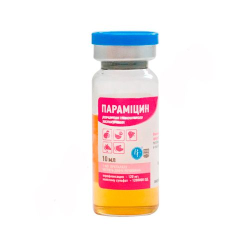 Параміцин антибактеріальний препаратРідина від світло-жовтого до жовтувато-коричневого кольору допускається незначний осад.склад1 мл препарату містить діючі речовини:енрофлоксацин 120,0 мгколістину сульфат - 1200000 ОД.ВластивостіПараміцин комбінований препарат, до складу якого входять енрофлоксацин та колістину сульфат.Внаслідок синергізму активних речовин активність препарату значно вища, ніж його окремо взятих компонентів.Енрофлоксацин належить до антибіотиків групи фторхінолонів.Механізм його дії повязаний з пригніченням субодиниці ДНК-гірази (топоізомераза II) грамнеотрицательних бактерій, що блокує процес суперспіралізації молекули ДНК.У грампозитивних бактерій цей процес впливає на топоізомеразу IV, а не на топоізомеразу II.За цих умов блокуються транскрипція та рекомбінаційні процеси у ДНК бактерії.Енрофлоксацин має бактерицидну дію проти грампозитивних (Staphylococcus spp., Streptococcus spp., Clostridium spp., Listeria monocytogenes, Corynebacterium spp. та інших) та грамнегативних мікроорганізмів (E. сoli, Salmonella spp., Klebsiella spp., Klebsiella spp. ., Bordetella spp. та інших), а також діє на мікоплазми (Mycoplasma gallisepticum, Mycoplasma synoviae, Mycoplasma hyosynoviae,Колістин антибіотик групи поліміксинів, які синтезуються аеробною спороутворювальною паличкою Bacillus polymyxa.Він діє бактерицидно на грамнегативні бактерії (такі як E. coli, Salmonella spp., Pseudomonas spp.), звязуючись з фосфоліпідами цитоплазматичної мембрани, посилюючи її проникність як для внутрішньо-, так і для зовнішньоклітинних компонентів, що призводить до деструкції клітинних барєрів. лізису бактеріальної клітини.ЗастосуванняТелята у віці до 3 місяців: лікування тварин, хворих на бронхопневмонію, пневмонію, ентерит, колібацильоз, омфаліт, сальмонельоз, мікоплазмоз, які викликані мікроорганізмами, чутливими до енрофлоксацину і колістину, а також при вторинних інфекціях.Свині всіх вікових категорій: лікування тварин, хворих на колібацильоз, пастерельоз, мікоплазмоз, сальмонельоз, атрофічний риніт, ензоотичну пневмонію, синдром ММА (метрит-мастит-агалактія), які викликані мікроорганізмами, чутливими до енрофлоксацину.Курчата, кури-бройлери, індики: лікування птиці, хворої на колібактеріоз, пастерельоз, сальмонельоз, мікоплазмоз, хронічні респіраторні інфекції (CRD), стафілококоз і кампілобактеріоз, які викликані мікроорганізмами, чутливими до енрофлоксацину.ДозуванняПерорально з питною водою або молоком у дозі:- свині, телята віком до 3 місяців - 0,5-0,8 мл препарату на 10 кг маси тіла щодобово- свійський птах (курчата, кури-бройлери, індики) -0,5-1,0 мл препарату на 1 л питної води щодобово.Курс лікування 5 діб.Застосовують препарат із інтервалом 24 години.Перед використанням ампулу або флакон (каністру) із розчином збовтати.У період лікування тварини повинні отримувати лише воду, яка містить препарат.Щодня готують свіжий розчин препарату в обсязі, розрахованому на споживання протягом доби.ПротипоказанняПідвищена чутливість до енрофлоксацину та колістину.Не застосовувати тваринам при тяжких порушеннях функції нирок та печінки.Не застосовувати одночасно з препаратами тетрациклінового ряду, макролідами (еритроміцином), хлорамфеніколом, теофіліном.Не застосовувати жуйним тваринам з функціонально розвиненими передшлунками.Не застосовувати курям-несучкам, яйця яких призначені для використання в їжу людям.ЗастереженняСпочатку препарат випробовують на 