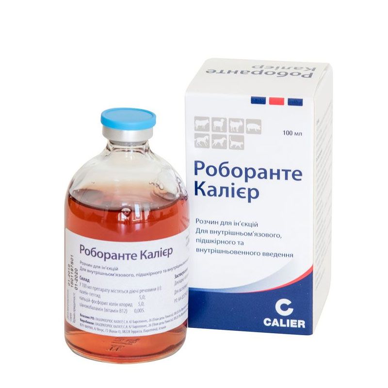 Іспанська Роборанте Калиер 100 мл випускається у формі інєкційного розчину насиченого рожевого кольору. Має запах специфічних компонентів, що входять до складу.СкладВ 100 мл розчину міститься: активно діючих речовин: пептид у вигляді казеїнового протеїну 5 мг, ліпід фосфорилхолин кальцій хлорид 5 мг комплекс вітамінів і мінералів, що складається з 19 амінокислот, необхідних для здорового розвитку і функціонування організму, вітаміну В12 (ціанокобаламіну) 0,005 мг, і допоміжних добавок. Фармакологічна діяПептиди казеїнової групи протеїнів служать повноцінним білком, придатним до прямого засвоєнню організмом.Желчеобразующий і жовчогінний фосфорилхолиновий ліпід кальцій хлориду служить донором метильних груп. Разом з вітаміном В12 виводять з організму токсини і не дають йому передчасно старіти. Бере участь в утворенні енергетичного агента лецитину.Вітамінний і амінокислотний комплекс забезпечують нормальний синтез креатину і метіоніну в будові білка, сприяє засвоєнню поживних речовин, нормалізує метаболічні процеси.Роборанте здатний зберігати азотний баланс, сприяючи регенерації тканин організму і створення імуноглобулінів.Показання до застосуванняЗасіб показаний до застосування у випадках: дисбалансів виснаження септицемії дефіцит корисних речовин неврологічних захворювань порушень репродуктивної функції анемії інтоксикації періоду відновлення після захворювань, пологів.Застосовуються дозиЗастосування шляхом введення активних речовин розчину з допомогою підшкірної, внутрішньомязової або внутрішньовенної інєкції. Дозування і використання засобу залежить від виду, віку і маси тварини: худобі підшкірно або внутрішньовенно 5-25 мл коням підшкірно (в тяжких випадках внутрішньовенно) 5-20 мл свиням підшкірно 5-10 мл козам і вівцям підшкірно або внутрішньомязово 2-5 мл собакам підшкірно або внутрішньомязово 0,5-5 мл котів, кроликів та інших невеликим тваринам 0,5-2,5 млПобічний впливНе виявлено. Використовувати строго за рекомендаціями ветеринарного спеціаліста.