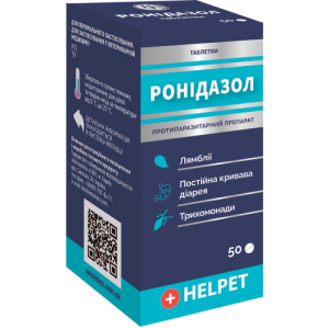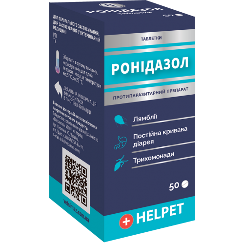 ОПИСПігулки в цукровій оболонці.СкладОдна таблетка містить діючу речовину:ронідазол 30 мг.Допоміжні речовини: полівінілпіролідон, крохмаль картопляний, стеарат кальцію, тальк, альбумін, сухе молоко, ароматизатор, лактоза.ФАРМАКОЛОГІЧНІ ВЛАСТИВОСТІATCvet QP51, антипротозойні ветеринарні препарати.Ронідазол (група нітроімідазольних сполук) діє на найпростіші, трихомонади та анаеробні бактерії. Зєднання продуктів реакції ронідазолу з ДНК найпростіших клітин або бактерій призводить до її загибелі. Створення міцних сполук значно посилює кислий внутрішньоклітинний рівень pH, що, крім іншого, підтверджує вибіркову дію похідних 5-нітромідазолу щодо анаеробних бактерій та деяких найпростіших. Крім того, в результаті реакції ронідазолу створюються продукти, що являють собою внутрішньоклітинні донори вільних аеробних радикалів, які додатково ушкоджують інші, ніж ДНК, молекули внутрішньоклітинних. Це посилює клітинне руйнування і призводить до найшвидшої загибелі найпростіших або бактерій.Після перорального застосування ронідазол майже повністю швидко абсорбується з травного каналу та досягає максимальної концентрації в плазмі крові через 12-14 годин. Його біодоступність становить понад 90.Термін дії ронідазолу у плазмі після перорального застосування для більшості тварин становить приблизно 11 годин, блокуючи його репродукцію шляхом інгібування синтезу ДНК. Ронідазол, при застосуванні тваринам одноразової пероральної дози, показав, що екскретується 30-36 дози із сечею та 16-40 з калом протягом 24 годин. Подальша екскреція повільна та неповна.Препарат у рекомендованих дозах не має сенсибілізуючої, ембріотоксичної і тератогенної дії.ЗАСТОСУВАННЯПрофілактика та лікування голубів та декоративних птахів за трихомонозу (Trichomonas gallinae), гексамітіазу (Hexamita columbae), Cochlosoma spp. та інших протозойних захворюваннях, собак та котів при захворюваннях шлунково-кишкового тракту та інших органів і тканин, спричинених найпростішими Trichomonas spp. Giardia spp.ДОЗУВАННЯСобаки: при лікуванні тварин, уражених лямбліозом (гіардіозром) Giardia spp. таблетки застосовують перорально, 1 раз на добу в дозі 30-50 мг на 1 кг маси тіла тварини курсом 7 днів.Коти: при лікуванні тварин, уражених лямбліозом (гіардіозом) таблетки застосовую ть перорально, 1 раз на добу, в дозі: 30мг на 1 кг маси тіла тварини протягом 7 днів.При лікуванні інфекцій, викликаних Trichomonas foetus препарат застосовують перорально 1 раз на добу в дозі 30 мг на 1 кг маси тіла тварини курсом 14 днів.Голуби: Для лікування та профілактики у голубів та декоративних птахів трихомонозу (Trichomonas gallinae), гексамітіазу (Hexamita columbae) та інших протозойних захворюваннях.Рекомендована профілактична доза 1 таблетка на голуба. Курс лікування: 1-3 діб.Рекомендована лікувальна доза 1 таблетка на голуба. Курс лікування: 3-5 діб.ПРОТИПОКАЗАННЯПідвищена чутливість до компонентів препарату.Не застосовувати котам, собакам та птиці з ознаками вірусної інфекції, порушеннями функцій нервової системи, нирок і печінки.Не застосовувати вагітним та лактуючим тваринам.ЗАСТЕРЕЖЕННЯПрепарат застосовувати згідно з рекомендаціями до застосування.Слід дотримуватися рекомендованих доз.Лікування тварин та птахів повинно поєднуватися з дезінфекцією приміщень, вольєрів, кліток, де утримуються хворі тварини та птиця, щоб уникнути можливості перезараження.Домашніх