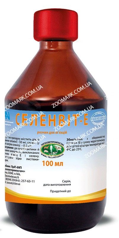 Склад:1 мл препарату містить діючі речовини (мг): вітамін Е - 50,0 селен (у формі селенита натрію) - 0,5.Фармакологічні властивості:Селенвит-Е заповнює недолік вітаміну Е і селену в організмі тварин.Вітамін Е регулює окислювально-відновні процеси, обмін вуглеводів та жирів, підсилює дію вітамінів А і D3, покращує імунітет організму. Біологічна роль селену повязана з його антиоксидантними властивостями. Він сприяє виведенню токсичних речовин з організму, засвоєнню кисню клітинами, підвищенню імунітету.Застосування:Препарат застосовують для профілактики і лікування великої рогатої худоби, коней, овець, кіз, свиней, собак, котів, хутрових звірів і курей при захворюваннях, викликаних нестачею вітаміну Е і селену (беломишечная хвороба, травматичний міозит, кардіопатія, токсична дистрофія печінки) при стресах, порушеннях репродукції та розвитку плода, затримки росту, недостатній приріст маси тіла, інфекційних та інвазійних захворювань, профілактичні щеплення та дегельмінтизації, отруєння нітратами, важкими металами, мікотоксинами.Дозування:З профілактичною метою препарат вводять тваринам внутрішньомязово або підшкірно (коням тільки внутрішньомязово) одноразово в дозі:велика рогата худоба, коні, вівці, кози, свині (дорослі тварини) - 1 мл препарату на 50 кг маси тіламолодняк сільськогосподарських тварин - 0,2 мл препарату на 10 кг маси тіласобаки, коти, хутрові звірі - 0,04 мл препарату на 1 кг маси тіла.З лікувальною метою препарат вводять тваринам внутрішньомязово або підшкірно (коням тільки внутрішньомязово) одноразово в дозі:велика рогата худоба, коні, вівці, кози, свині (дорослі тварини) - 1 мл препарату на 30 кг маси тіламолодняк сільськогосподарських тварин - 0,3 мл препарату на 10 кг маси тіласобаки, коти, хутрові звірі - 0,05 мл препарату на 1 кг маси тіла.При необхідності інєкцію препарату повторюють через 2-3 тижні в тих же дозах.Для профілактики акушерсько-гінекологічних захворювань у тільних корів, препарат вводять двічі: за 3-4 тижні до отелення і після пологів. Супоросним свиноматкам препарат застосовують по 1,5-2 місяці до опоросу.Для зручності введення малих обсягів препарату, його можна розбавити стерильною водою або фізіологічним розчином і ретельно перемішати.Для лікування птиці препарат застосовують 2-3 рази з інтервалом 1-2 тижні з питною водою в розведенні 1:100 (1 частина препарату на 99 частин води) в розрахунку - 1мл препарату на 1 кг маси тіла або 2 мл на 1 л питної води.З профілактичною метою курчатам, починаючи з добового віку, застосовують препарат у тих же дозах 1 раз в 2-3 тижні, молодняку, починаючи з 30-добового віку, і дорослої птиці - 1 раз в місяць.Максимальні разові дози препарату (мл на одну тварину):велика рогата худоба 15,0телята 2,0-4,0коні 15,0лошата 2,0-4,0вівці, кози 2,5ягнята, козенята 1,0-2,0свині 4,0поросята 0,5-2,0.Протипоказання:Не застосовувати при підвищеній чутливості до препарату, надлишковому вмісті селену в організмі чи кормах.Застереження:При одноразовій дозі більше 10 мл препарат поділяють і вводять у різні місця.З обережністю застосовувати вагітним тваринам.Період виведення (каренціі)Продукцію тваринного походження в їжу людям можна використовувати без обмеження крім печінки, використовувати яку можна через сім діб після останнього застосування препарату. До зазначеного терміну печінку утилізують або згодовують непродук