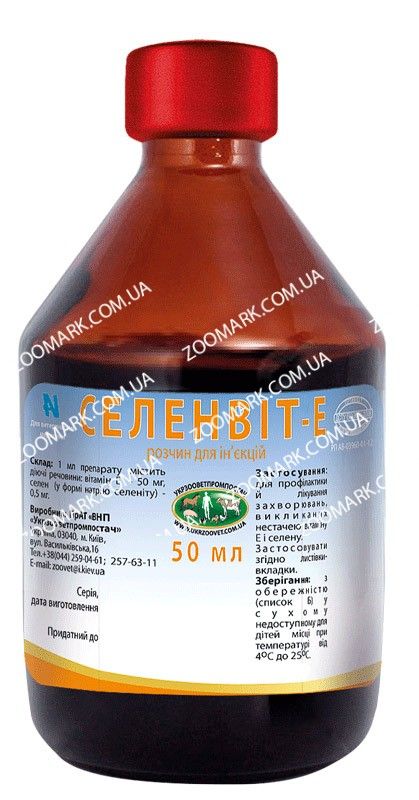 Склад:1 мл препарату містить діючі речовини (мг): вітамін Е - 50,0 селен (у формі селенита натрію) - 0,5.Фармакологічні властивості:Селенвит-Е заповнює недолік вітаміну Е і селену в організмі тварин.Вітамін Е регулює окислювально-відновні процеси, обмін вуглеводів та жирів, підсилює дію вітамінів А і D3, покращує імунітет організму. Біологічна роль селену повязана з його антиоксидантними властивостями. Він сприяє виведенню токсичних речовин з організму, засвоєнню кисню клітинами, підвищенню імунітету.Застосування:Препарат застосовують для профілактики і лікування великої рогатої худоби, коней, овець, кіз, свиней, собак, котів, хутрових звірів і курей при захворюваннях, викликаних нестачею вітаміну Е і селену (беломишечная хвороба, травматичний міозит, кардіопатія, токсична дистрофія печінки) при стресах, порушеннях репродукції та розвитку плода, затримки росту, недостатній приріст маси тіла, інфекційних та інвазійних захворювань, профілактичні щеплення та дегельмінтизації, отруєння нітратами, важкими металами, мікотоксинами.Дозування:З профілактичною метою препарат вводять тваринам внутрішньомязово або підшкірно (коням тільки внутрішньомязово) одноразово в дозі:велика рогата худоба, коні, вівці, кози, свині (дорослі тварини) - 1 мл препарату на 50 кг маси тіламолодняк сільськогосподарських тварин - 0,2 мл препарату на 10 кг маси тіласобаки, коти, хутрові звірі - 0,04 мл препарату на 1 кг маси тіла.З лікувальною метою препарат вводять тваринам внутрішньомязово або підшкірно (коням тільки внутрішньомязово) одноразово в дозі:велика рогата худоба, коні, вівці, кози, свині (дорослі тварини) - 1 мл препарату на 30 кг маси тіламолодняк сільськогосподарських тварин - 0,3 мл препарату на 10 кг маси тіласобаки, коти, хутрові звірі - 0,05 мл препарату на 1 кг маси тіла.При необхідності інєкцію препарату повторюють через 2-3 тижні в тих же дозах.Для профілактики акушерсько-гінекологічних захворювань у тільних корів, препарат вводять двічі: за 3-4 тижні до отелення і після пологів. Супоросним свиноматкам препарат застосовують по 1,5-2 місяці до опоросу.Для зручності введення малих обсягів препарату, його можна розбавити стерильною водою або фізіологічним розчином і ретельно перемішати.Для лікування птиці препарат застосовують 2-3 рази з інтервалом 1-2 тижні з питною водою в розведенні 1:100 (1 частина препарату на 99 частин води) в розрахунку - 1мл препарату на 1 кг маси тіла або 2 мл на 1 л питної води.З профілактичною метою курчатам, починаючи з добового віку, застосовують препарат у тих же дозах 1 раз в 2-3 тижні, молодняку, починаючи з 30-добового віку, і дорослої птиці - 1 раз в місяць.Максимальні разові дози препарату (мл на одну тварину):велика рогата худоба 15,0телята 2,0-4,0коні 15,0лошата 2,0-4,0вівці, кози 2,5ягнята, козенята 1,0-2,0свині 4,0поросята 0,5-2,0.Протипоказання:Не застосовувати при підвищеній чутливості до препарату, надлишковому вмісті селену в організмі чи кормах.Застереження:При одноразовій дозі більше 10 мл препарат поділяють і вводять у різні місця.З обережністю застосовувати вагітним тваринам.Період виведення (каренціі)Продукцію тваринного походження в їжу людям можна використовувати без обмеження крім печінки, використовувати яку можна через сім діб після останнього застосування препарату. До зазначеного терміну печінку утилізують або згодовують непродук