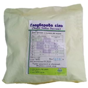 Глауберова сіль (натрію сульфат 10-водний) є безбарвними, прозорими кристалами, що вивітрюються на повітрі або відволожують, без запаху, гірко-солоного смаку, добре розчиняються у воді.Порядок застосування та дозування як антидот при отруєннях солями металів (особливо міді, барію, ртуті, свинцю та ін.).2 розчини) застосовують для підвищення апетиту та поліпшення травлення.У формі розчину 1 використовують при гіпотонії та атонії передшлунків шляхом промивання рубця через шлунковий зонд.запорах, переповненні та засміченні кишечника, метеоризмі.ПротипоказанняНе можна призначати глауберову сіль виснаженим, зневодненим тваринам.Побічна діяЗважаючи нависокий зміст іонів натрію слід призначати препарат з обережністю старим тваринам, а також тваринам з вираженою серцевою недостатністю.Особливості застосуванняПри застосуванні глауберової солі як проносного тваринам необхідно багато пити.Так як натрію сульфат не всмоктується в кров і не накопичується в тканинах, мясо забитих тварин придатне до споживання без обмеження.Умови зберіганняНеобхідно враховувати вплив умов зберігання на якість препарату.У сухому місці він може втрачати кристалізаційну воду (порошок з прозорого стає білим).У спекотну погоду, при зберіганні в ангарах при температурі 33 С стає рідким.У сирому приміщенні відволожується і пливе.