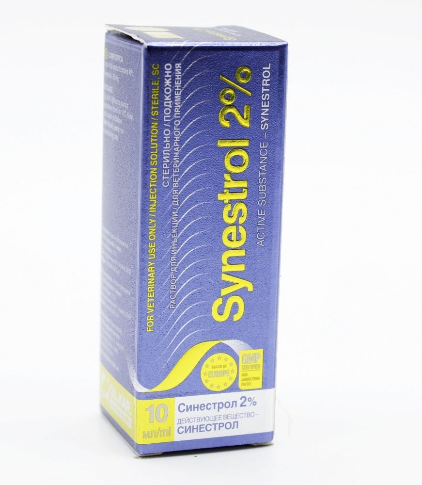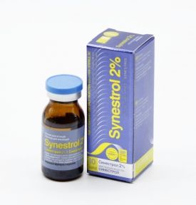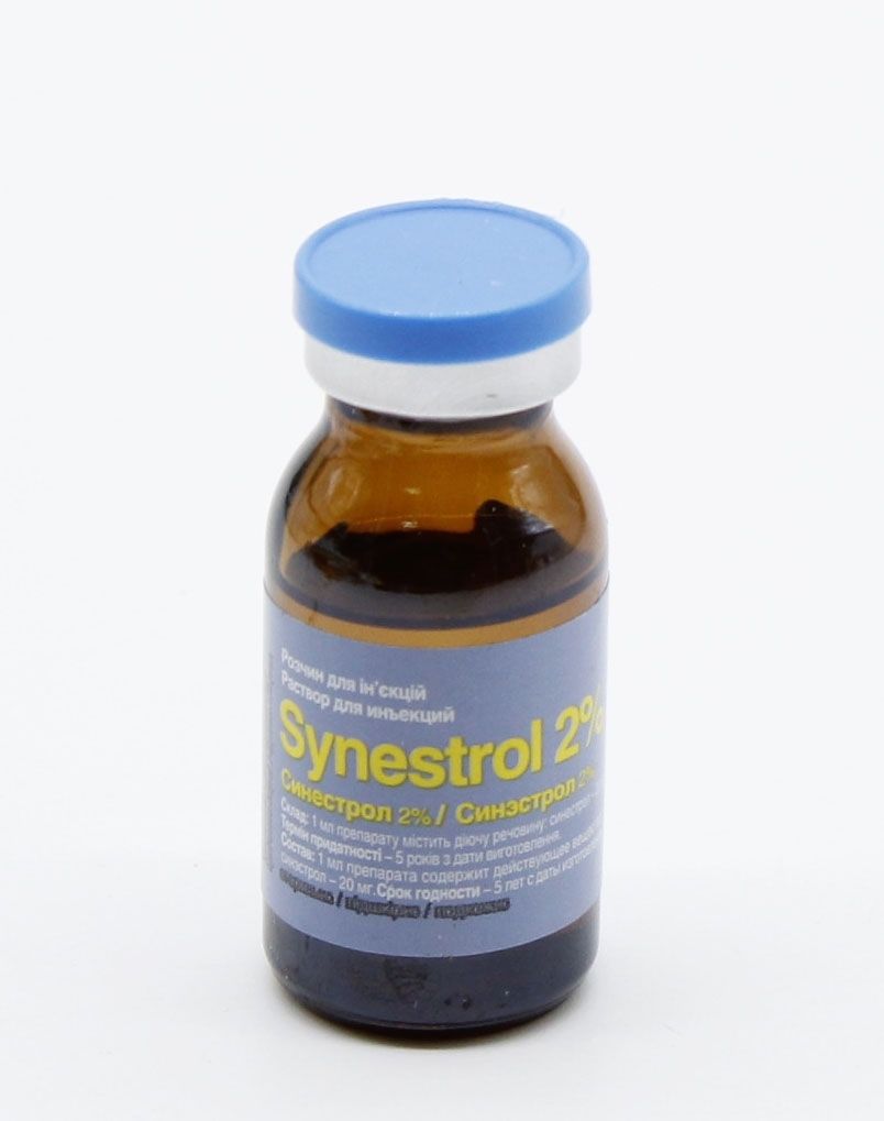Розчин для інєкцій Синестрол 2 на лікування ендометритів у тварин 10 мл.Прозорий масляний розчин жовтого кольору.Склад1 мл препарату містить діючу речовину:синестрол 20 мг.Фармакологічні властивостіСинестрол гормональний препарат, за біологічними та лікувальними властивостями близький до стероїдних естрогенних гормонів.Після застосування синестролу у статевих шляхах самок зявляються зміни, що спостерігаються при тічці (підсилюється кровопостачання статевих органів, активізуються процеси проліферації ендометрію, відбуваються зміни молочних залоз).Після введення препарат швидко всмоктується з місця інєкції та розповсюджується в органах тварин.Розчинсинестролу 2 застосовують для лікування ендометритів у тварин, для видалення посліду та муміфікованих плодів, для підвищення функції молочних залоз, для прояву полювання у здорових самок (гіпофункція яєчників).ДозуванняЗастосовують синестрол 2 підшкірно коровам та коням по 0,25-2,5 мл при хворобах яєчників та стимуляції тічки дворазово через 18-24 години при ендометритах у тих самих дозах протягом 6-8 днів.ПротипоказанняНе застосовувати при хворобах печінки, нирок, вагітності.ЗастереженняПродукти тваринництва під час та після застосування розчину синестролу 2 використовують без обмежень.Форма випускуФлакони 10 мл упаковані у коробки.Сухе, темне, недоступне для дітей місце при температурі від 5 до 10 С.Не зберігати разом із продуктами харчування, напоями та кормами для тварин.Термін придатності 5 років із дня виготовлення.