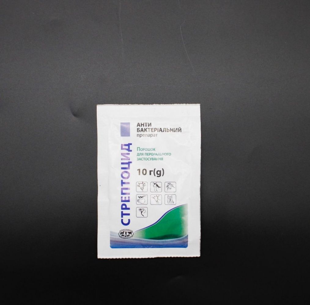 Стрептоцидпорошок для орального застосуванняФорма випускуЛаміновані пакети:10 гСклад100 г препарату містить не менше 99 г стрептоциду білого.Фармакологічні властивостіАнтибактеріальний засіб широкого спектру дії. Сульфаніламід (стрептоцид) - один з перших представників хіміотерапевтичних засобів групи сульфаніламідів. Має бактеріостатичну дію. Механізм дії обумовлений конкурентним антагонізмом з ПАБК і конкурентним пригніченням ферменту дигідроптероатсинтетази. Це призводить до порушення синтезу дигідрофолієвої, а потім тетрагідрофолієвої кислоти і в результаті - до порушення синтезу нуклеїнових кислот.Сульфаніламід активний відносно грампозитивних і грамнегативних коків, Escherichia coli, Shigella spp., Vibrio cholerae, Haemophilus influenzae, Clostridium spp., Bacillus anthracis, Corynebacterium diphtheriae, Yersinia spp., а також відносно Chlamydia spp., Actinomyces spp., Toxoplasma gondii.ЗастосуванняСтрептоцид застосовують при:ангінах,стрептококових тонзилярних абсцесах,миті,бронхопневмонії,післяпологовому сепсисі,циститах,пієлітах,ентероколітах,а також для профілактики й лікування ранових інфекцій.ДозуванняПрепарат призначають усередину 4-6 разів на добу протягом 5-7 днів у наступних дозах:Види тваринДозаВелика рогата худоба5-10 гКоні5-10 гДрібна рогата худоба0,5-2 гСвині0,5-2 гСобаки0,5-1 гПесці і лисиці0,3-0,5 гЗастереженняЗабій тварин на мясо дозволяється через 5 діб після останнього застосування препарату, споживання молока в їжу людям через 3 доби. Мясо тварин, вимушено забитих до зазначеного терміну, можна використовувати на корм мясоїдним тваринам.ЗберіганняУ сухому, темному, недоступному для дітей місці, за температури від 5 до 250С.Термін придатності - 3 роки.