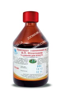 Для стимуляції приростів маси тіла при вирощуванні та відгодівлі великої рогатої худоби, свиней, овець терапії тварин при акушерсько-гінекологічних захворюваннях (метритах, ендометритах, запальних захворюваннях яєчників, затримці посліду, маститах) атонії передшлунків, ентеритах для загоєння довго незаживаючих ран і виразок підвищення захисних сил організму.Основні характеристики Препарат тканинний за Філатовим 100 млСклад:100 мл препарату містить: субстрат з тканин паренхіматозних органів (печінки, селезінки) здорових сільськогосподарських тварин - 33 гТип:Суспензія для інєкційПризначення:Для стимуляції приростів маси тіла при вирощуванні та відгодівлі великої рогатої худоби, свиней, овецьУмови зберігання:Зберігають в сухому, захищеному від світла місці при температурі від 2 до 11 С. Після першого відбору із флакону - 3 добиТермін придатності:2 рокиКраїна виробник:УкраїнаОбєм:100 млФорма випуску:Флакони з темного скла, які закупорені гумовими пробками і закатані алюмінієвими ковпачкамиДіюча речовина:Субстрат із тканин паренхіматозних органівЦільова група:ВРХ, Вівці , Свині