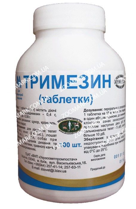 ТРИМЕЗИН(таблетки)листівка-вкладкаОписТаблетки плоскоциліндричної форми, білого кольору.Склад1 таблетка (1 г) містить діючі речовини:сульфадимезин - 0,4 г,триметоприм - 0,08 г.Допоміжні речовини: цукор, крохмаль, кальцію стеарат.Фармакологічні властивостіATC vet класифікаційний код QJ01 антибактеріальні ветеринарні препарати для системного застосування.QJ01EW03- Сульфадимідин (сульфадимезин) і триметоприм.Тримезин - комбінований препарат, до складу якого входять сульфадимезин та триметоприм.Сульфадимезин сульфаніламідний препарат широкого спектра дії. Він діє бактеріостатично проти грампозитивних і грамнегативних бактерій (E.coli, Staphylococcus spp., Streptococcus spp., Clostridium spp., Salmonella spp., Pasteurella spp., Listeria monocytogenes, Corynebacterium spp., Klebsiella spp., Proteus spp., Bordetella spp., Toxoplasma spp.таRickettsia spp.). Механізм дії повязаний з пара-амінобензойною кислотою та конкурентним пригніченням дигідроптероатсинтетази, що призводить до порушення синтезу тетрагідрофолієвої кислоти, необхідної для синтезу пуринів та піримідинів.Триметоприм хіміотерапевтичний засіб, що володіє бактеріостатичною дією проти грампозитивних (Staphylococcus spp., Streptococcus spp., Clostridium spp., Corynebacterium spp.і інші) та грамнегативних мікроорганізмів (Е. coli, Salmonella spp., Klebsiella spp., Proteus spp., Pasteurelia spp., Bordetella spp.тощо). Він інгібує активність бактеріальної редуктази, яка перетворює дегідрофолієву кислоту в тетрагідрофолієву, яка є необхідною для синтезу пуринів нуклеїнових кислот. Цим самим триметоприм блокує один із основних процесів метаболізму бактерій на шляху синтезу білка.Сульфадимезин швидко абсорбується з травного каналу (переважно в тонкому кишечнику), на 75-86 звязується з білками плазми. Добре проникає в тканини та рідини організму (в т.ч. легені, ліквор), швидко виводиться з організму, період напіввиведення становить 7 год. Елімінація здійснюється переважно нирками шляхом клубочкової фільтрації. У печінці піддається біотрансформації (ацетилюванню).Абсорбція триметоприму з травного каналу швидка і майже повна (90-100). Звязування з білками плазми становить 45. Швидко розподіляється в тканинах і рідинах організму. Триметоприм проходить через плаценту, проникає в грудне молоко. Нирками виводиться 50-60 триметоприму протягом 24 год в основному шляхом клубочкової фільтрації та канальцевої секреції, причому 80-90 - у незміненому вигляді, решта - у вигляді неактивних метаболітів. Невелика кількість (4) виводиться з жовчю.ЗастосуванняЛікування телят та ягнят віком до 3-х місяців, лошат віком 3-8 місяців, свиней та собак, хворих на сальмонельоз, колібактеріоз, мікоплазмоз, а також при захворюваннях органів дихання та сечостатевої системи, травного каналу, що спричинені мікроорганізмами, чутливими до триметоприму та сульфадимезину.ДозуванняПерорально з кормом, питною водою або молоком у дозі 1 таблетка (1 г) препарату на 15 кг маси тіла тварини щодобово. Дозу задають один раз на добу або розділяють на 2 рази і задають кожні 12 годин. У процесі лікування тваринам забезпечують вільний доступ до води. Препарат застосовують до зникнення клінічних ознак захворювання і протягом наступних двох діб (при лікуванні сальмонельозу телят - 5 діб), але не більш 10 діб.ПротипоказанняПідвищена чутливість до сульфадимезинута триметоприму, а також не застосовувати тваринам з порушенням функції органів кровотворення, печінки, нирок.Не застосовувати жуйним тваринам з фу