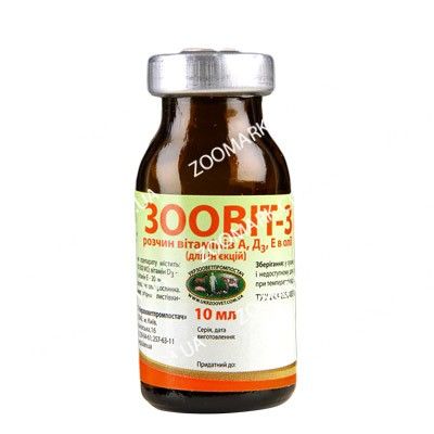 Препарат надає комплексну дію на організм тварин, що виражається в нормалізації обміну речовин, профілактики гіпо- та авітамінозів A, D3 і Е і захворювань, що розвиваються на їх тлі.Основні характеристики Зоовіт-3 оральний 10 млСклад:1 мл препарату містить діючі речовини: вітамін А - 10000 МО вітамін D3 - 15000 МО вітамін Е - 20 мгТип:Розчин для перорального застосуванняПризначення:Рахіт, остеодистрофія, післяродова гіпокальціємія та гіпофосфатемія, перед- і післяродове залежування, аліментарна дистрофія, бронхіт, бронхопневмонія, затримання посліду, субінволюція матки, ендометрит, гастроентерит, гепатодистрофія, гепатит, кетоз, гломерулонефриУмови зберігання:У сухому темному місці при температурі від 5С до 15СATC-vet класифікаційний код:QA11СТермін придатності:2 рокиКраїна виробник:УкраїнаМіжнародна назва:Zoovit oralОбєм:10 млФорма випуску:Скляні флакониДіюча речовина:Витамиіни А, D3, Е, групи В, амінокислотиЦільова група:Коні , Свині , Кури , Собаки ,ВРХ