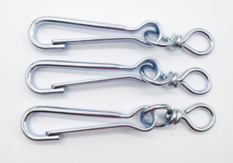 Надійний карабін з вертушкою та кільцем для кріплення повідців або ланцюгів для собак. Виготовлений із міцного металу, стійкого до корозії. Вертушка, що обертається, запобігає перекручуванню, забезпечуючи зручність і безпеку під час прогулянок або фіксації вихованця. Підходить для собак усіх порід.