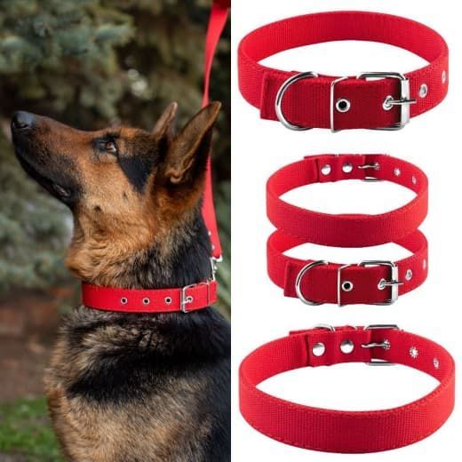 Економічний брезентовий нашийник подвійний, червоного кольору. Виготовлений з витривалого матеріалу з подвійним шаром для більшої міцності. Призначений для забезпечення комфорту та контролю над собакою під час прогулянок і тренувань.
