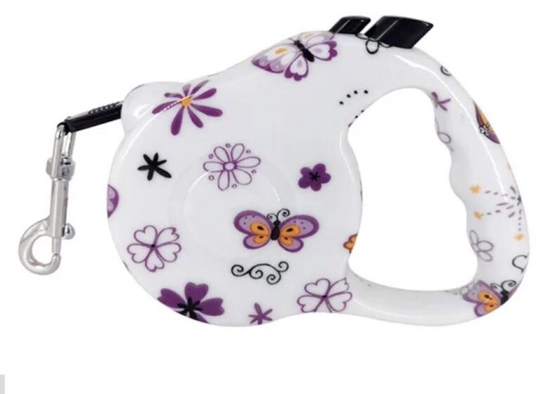 Рулетка для собак, малюнок метелика, 3м12кг, пластикова ручка з кнопкою для легкого зупинення та відпускання стрічки.