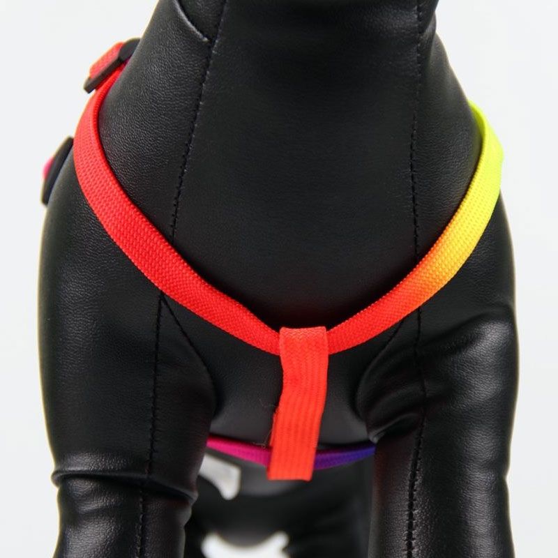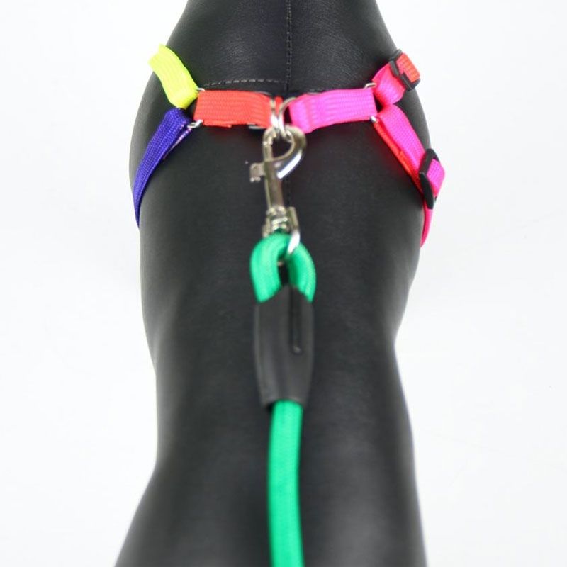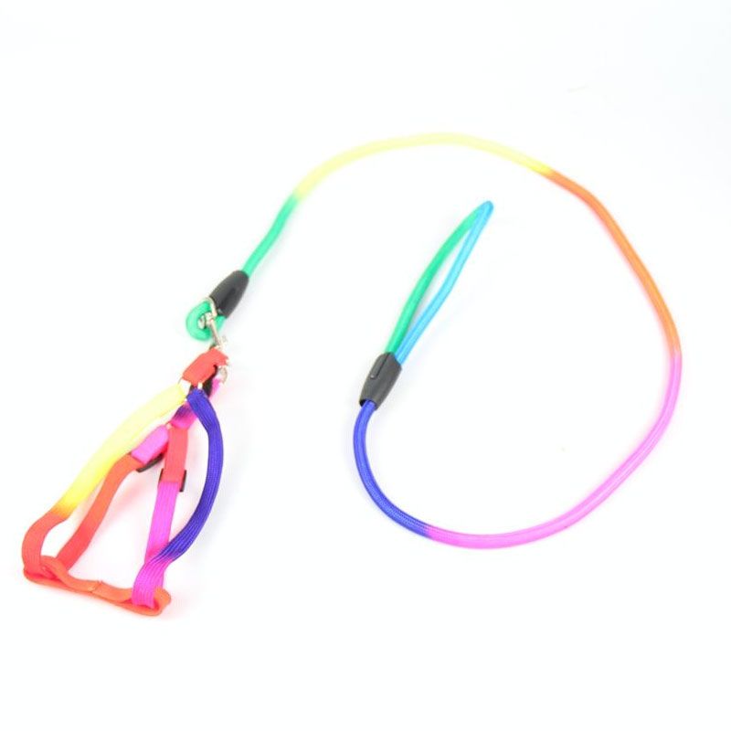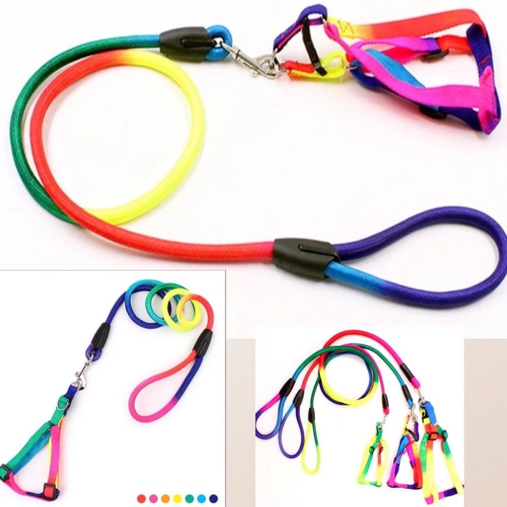 Яскравий комплект шлейки і повідця для собак забарвленням Веселка. Призначений для комфортних і веселих прогулянок з вашим вихованцем.комплект 1,512-15100 круглий шнур, ручка петля з кольором веселкиширина стрічки 1,5 см, шлея 24-30см