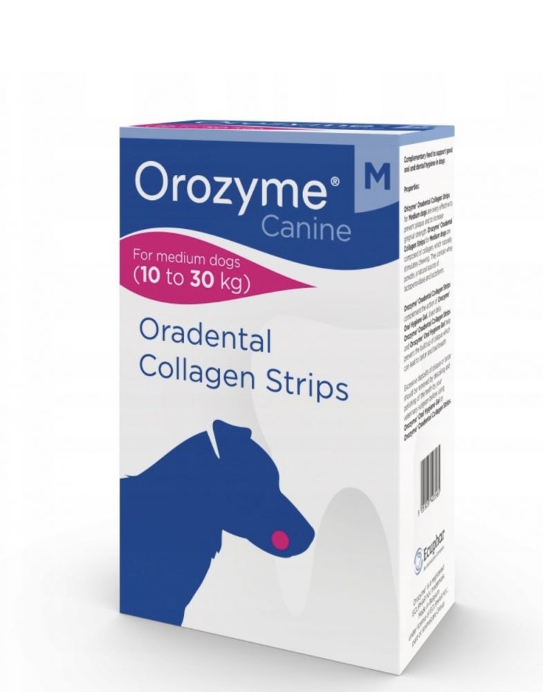 Колаген у жувальних смужках Orozyme може допомогти стимулювати природну жувальну здатність собакиДозволяє механічно протидіяти утворенню зубного нальоту, бореться з неприємним запахом з рота і запобігає утворенню зубного каменю.Чудове сприйняття жувальних смужок Orozyme базується на природному солодовому смаку. Ось так догляд за зубами перетворюється на задоволенняЖувальні смужки Orozyme можна використовувати для щоденного догляду за зубамиРекомендації щодо годування: собаці слід давати жувальну смужку двічі на день. Колагенові жувальні смужки для собак містять запатентовану формулу ферментів, яка покращує антибактеріальну дію слини собак. Додані антисептичні речовини, завданням яких є зниження кількості бактерій, відповідальних за неприємний запах і утворення зубного нальоту та зубного каменю. Смужки не розпадаються під час жування. Давати собаці їх дуже легко, тому що вони задовольняють природну потребу жувати. Продукт не містить цукру, штучних барвників і смакових речовин. Це гіпоалергенний засіб і характеризується низьким вмістом жиру. Запатентована система LPO Chew Strips, що міститься в Orozyme, у поєднанні з лізоцином і лактоферином запобігає утворенню бактеріальних бляшок. OROZYME Oradental Collagen Strips містять природні ферменти, які перешкоджають утворенню зубного каменю, видаляють наявний зубний наліт, перешкоджають розмноженню бактерій, що утворюють наліт, швидко усувають неприємний запах з рота, заспокоюють запалення ясен та інфекції, викликані бактеріями.