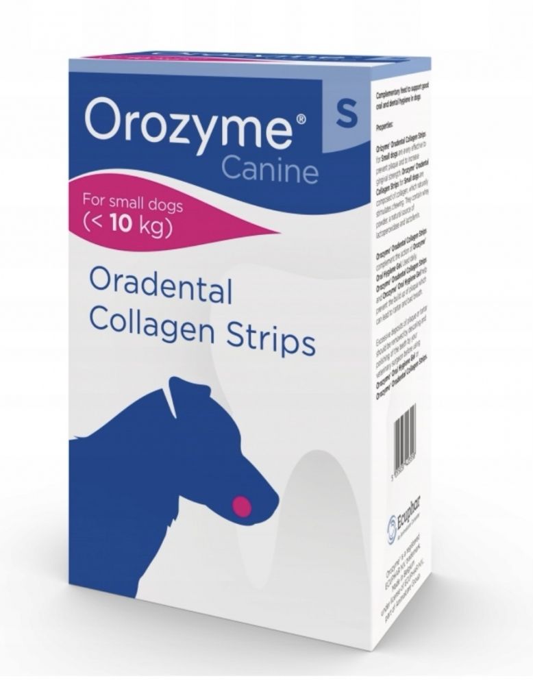 Колаген у жувальних смужках Orozyme може допомогти стимулювати природну жувальну здатність собакиДозволяє механічно протидіяти утворенню зубного нальоту, бореться з неприємним запахом з рота і запобігає утворенню зубного каменю.Чудове сприйняття жувальних смужок Orozyme базується на природному солодовому смаку. Ось так догляд за зубами перетворюється на задоволенняЖувальні смужки Orozyme можна використовувати для щоденного догляду за зубамиРекомендації щодо годування: собаці слід давати жувальну смужку двічі на день. Колагенові жувальні смужки для собак містять запатентовану формулу ферментів, яка покращує антибактеріальну дію слини собак. Додані антисептичні речовини, завданням яких є зниження кількості бактерій, відповідальних за неприємний запах і утворення зубного нальоту та зубного каменю. Смужки не розпадаються під час жування. Давати собаці їх дуже легко, тому що вони задовольняють природну потребу жувати. Продукт не містить цукру, штучних барвників і смакових речовин. Це гіпоалергенний засіб і характеризується низьким вмістом жиру. Запатентована система LPO Chew Strips, що міститься в Orozyme, у поєднанні з лізоцином і лактоферином запобігає утворенню бактеріальних бляшок. OROZYME Oradental Collagen Strips містять природні ферменти, які перешкоджають утворенню зубного каменю, видаляють наявний зубний наліт, перешкоджають розмноженню бактерій, що утворюють наліт, швидко усувають неприємний запах з рота, заспокоюють запалення ясен та інфекції, викликані бактеріями.
